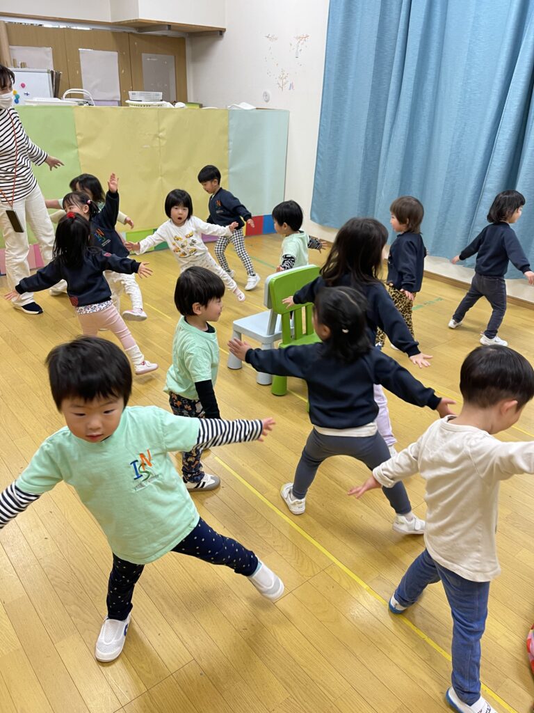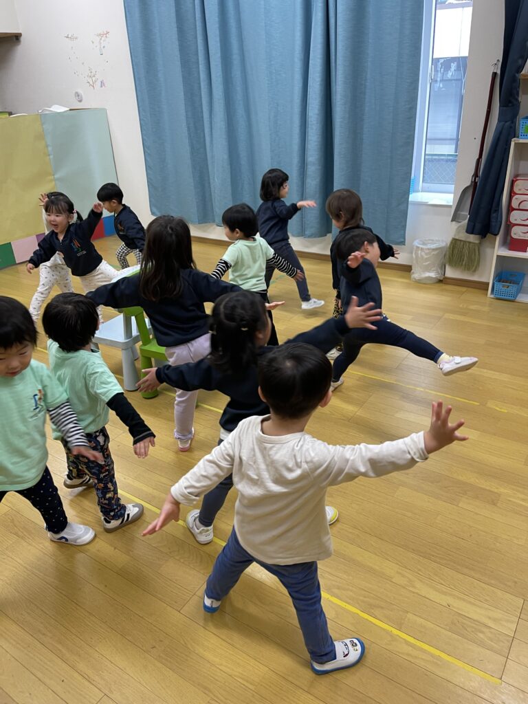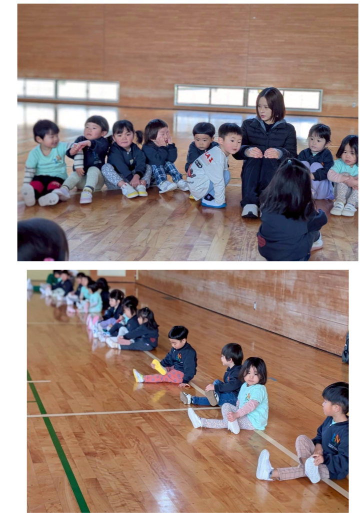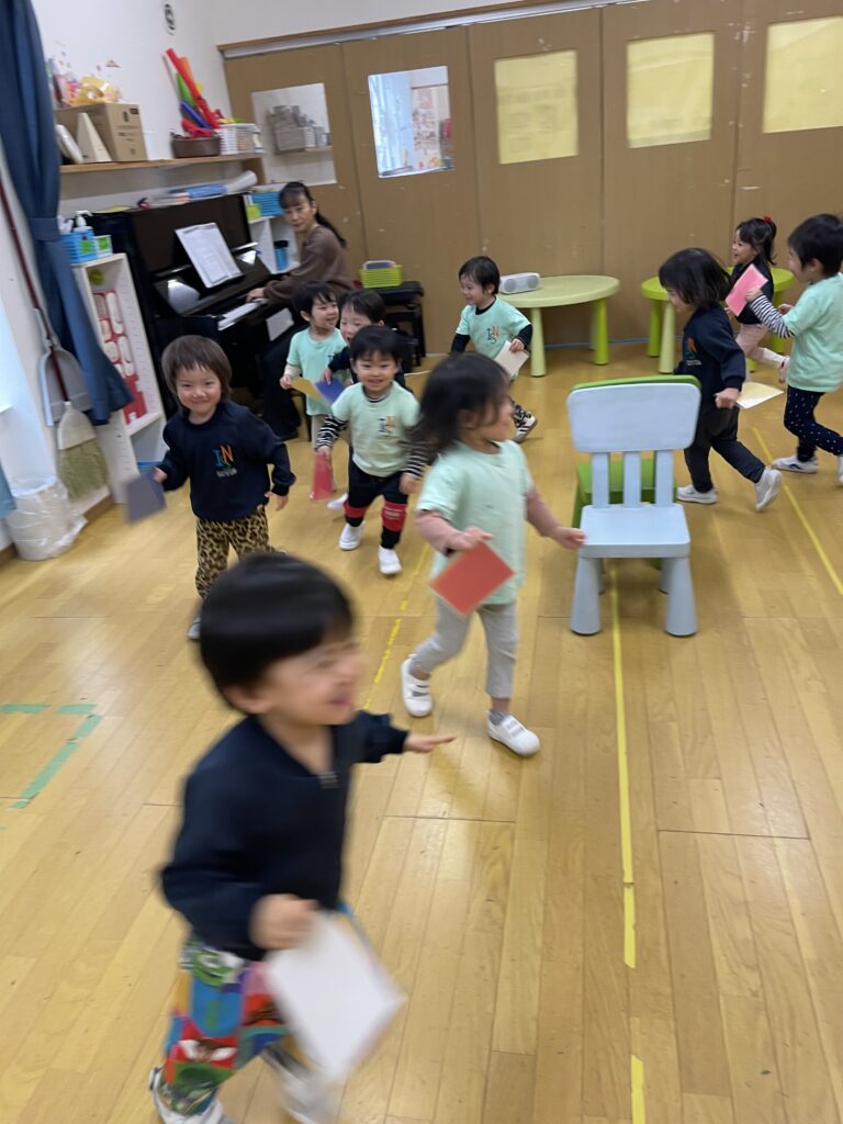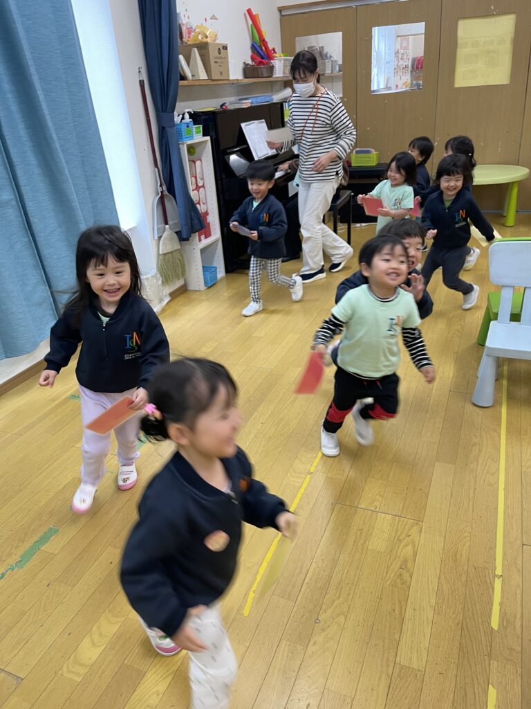 In addition, we incorporated movement activities to help the children connect with rhythm in a physical way. When the piano played fast, the children ran; when the tempo slowed down, they walked; and when the music had a swinging feel, they gently swayed their bodies.