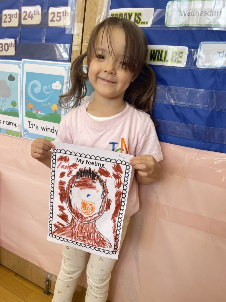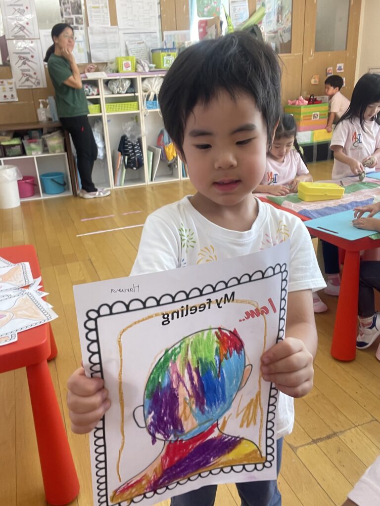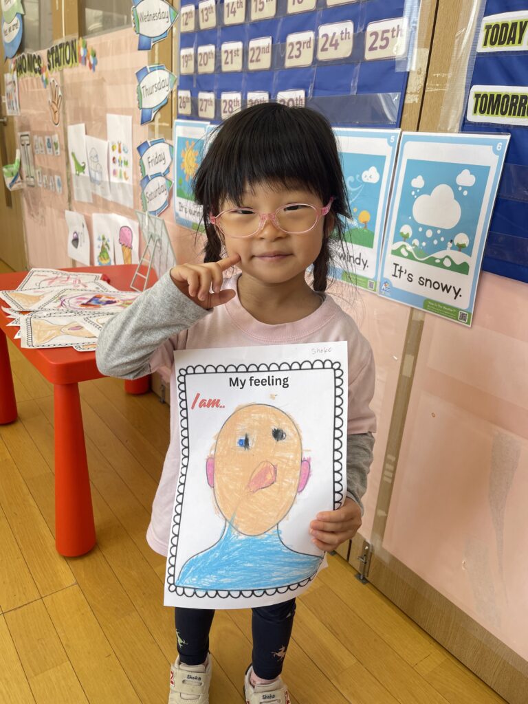After finishing their drawings, we talked about the question, “How are you today?” Most of the children proudly said, “I’m happy!” while showing their artwork. To help them think about other emotions, I showed a sad face—and right away, they guessed, “Sad!” The children then enjoyed trying out and naming other feelings like excited, scared, angry, surprised, proud, and nervous.