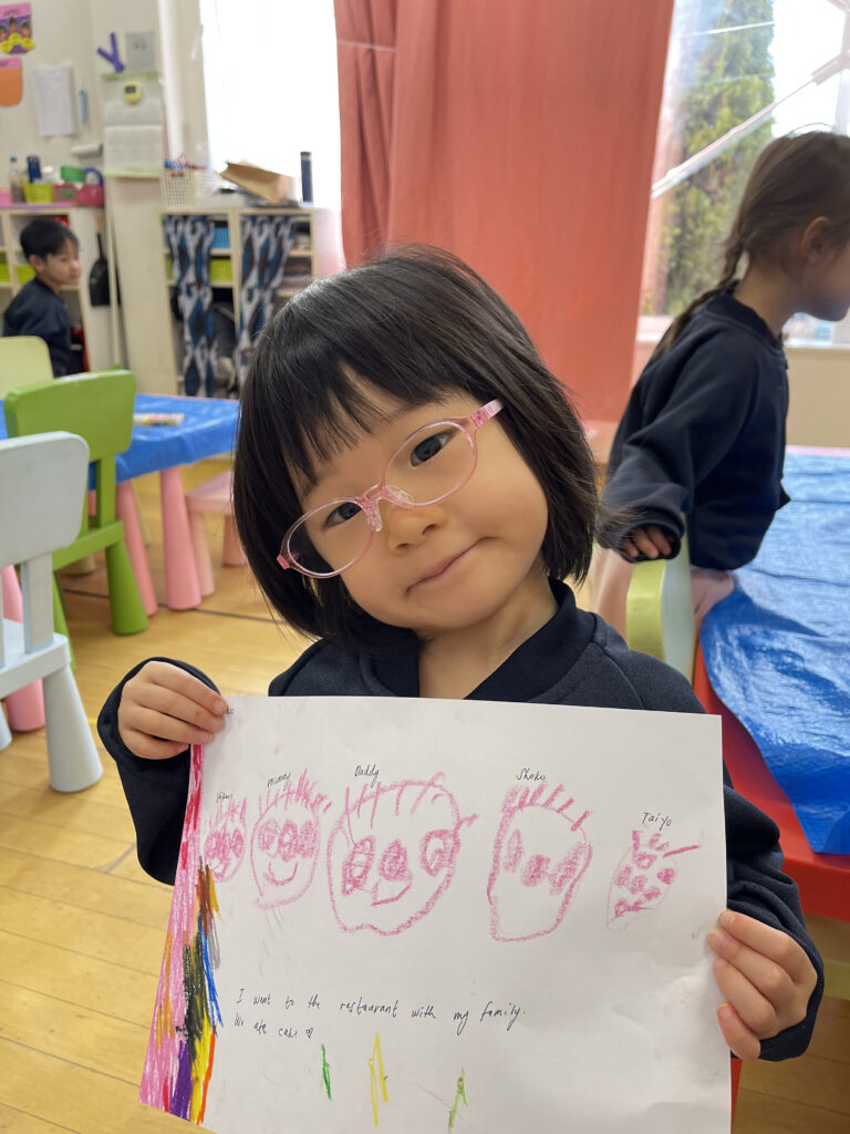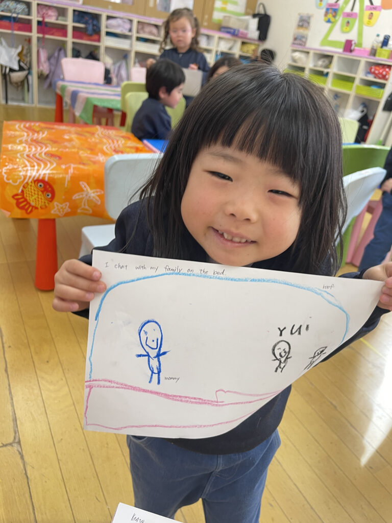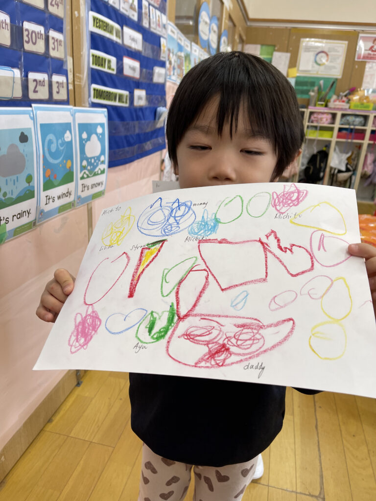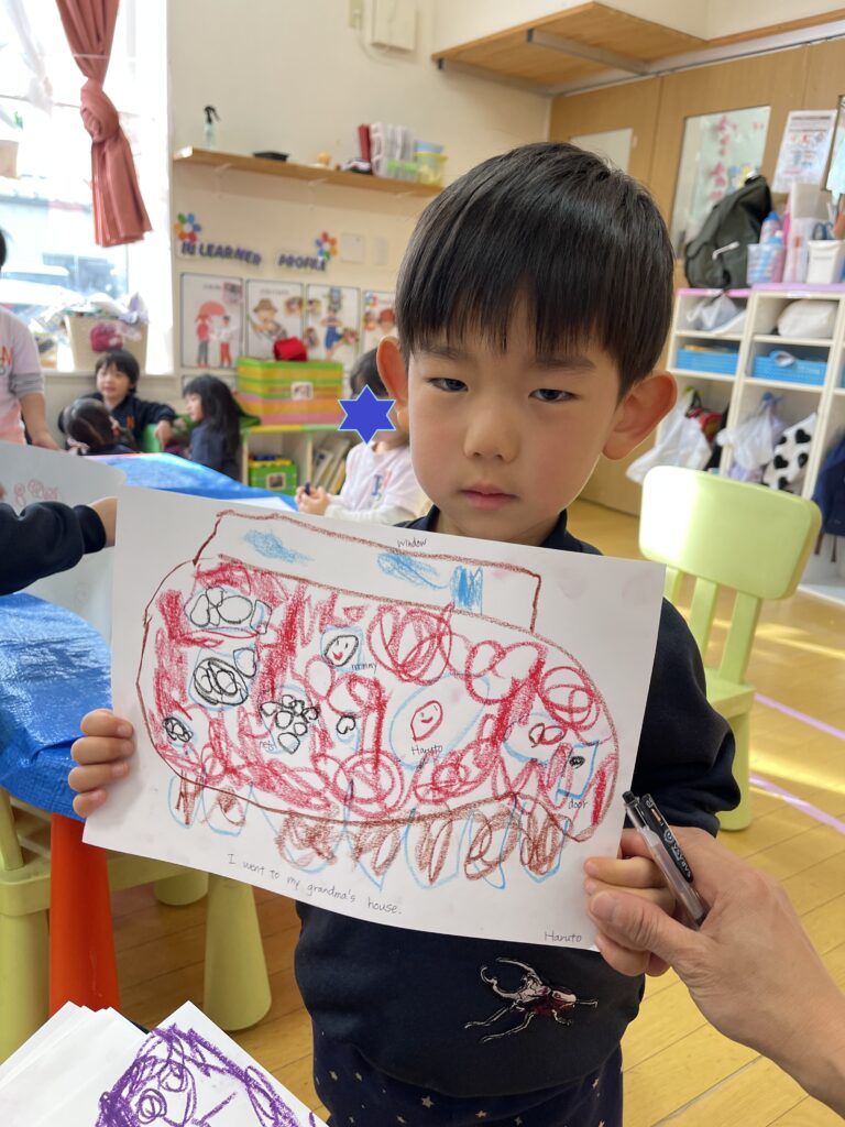 お休みの間に何をしたこと、行ったところなど、みんなの前で自分の体験を発表して熱くれました☆そしてそれをみんなで絵に描いてみました!
