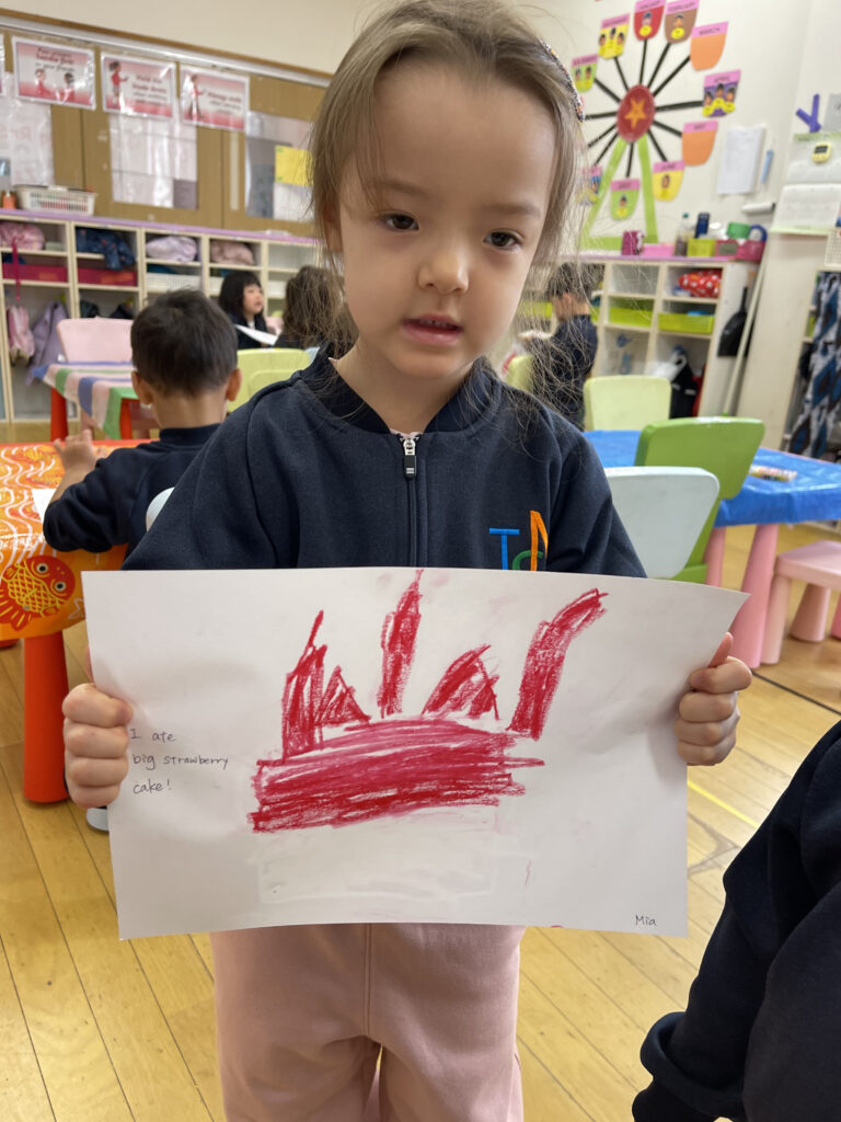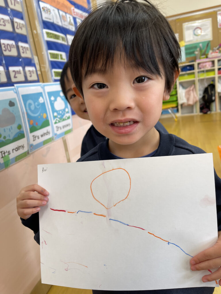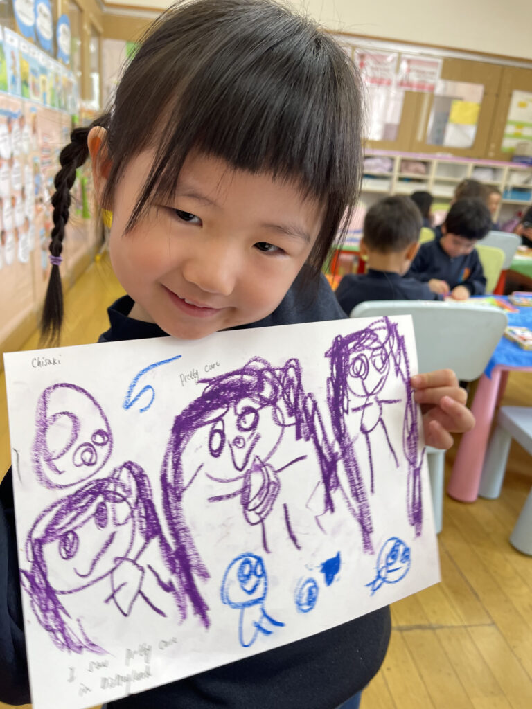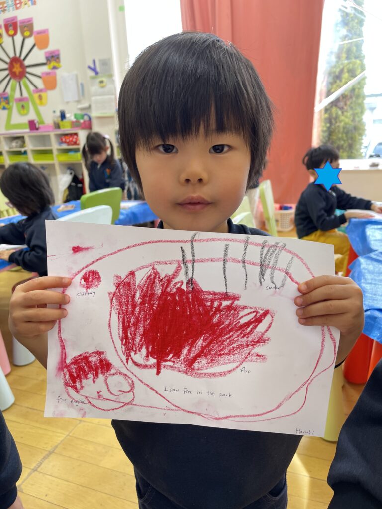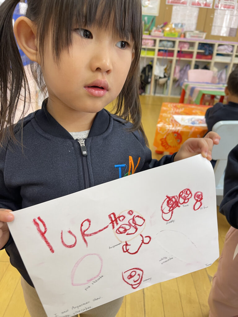 お休みの間に何をしたこと、行ったところなど、みんなの前で自分の体験を発表して熱くれました☆そしてそれをみんなで絵に描いてみました!