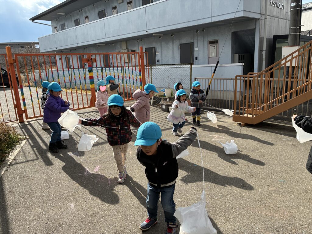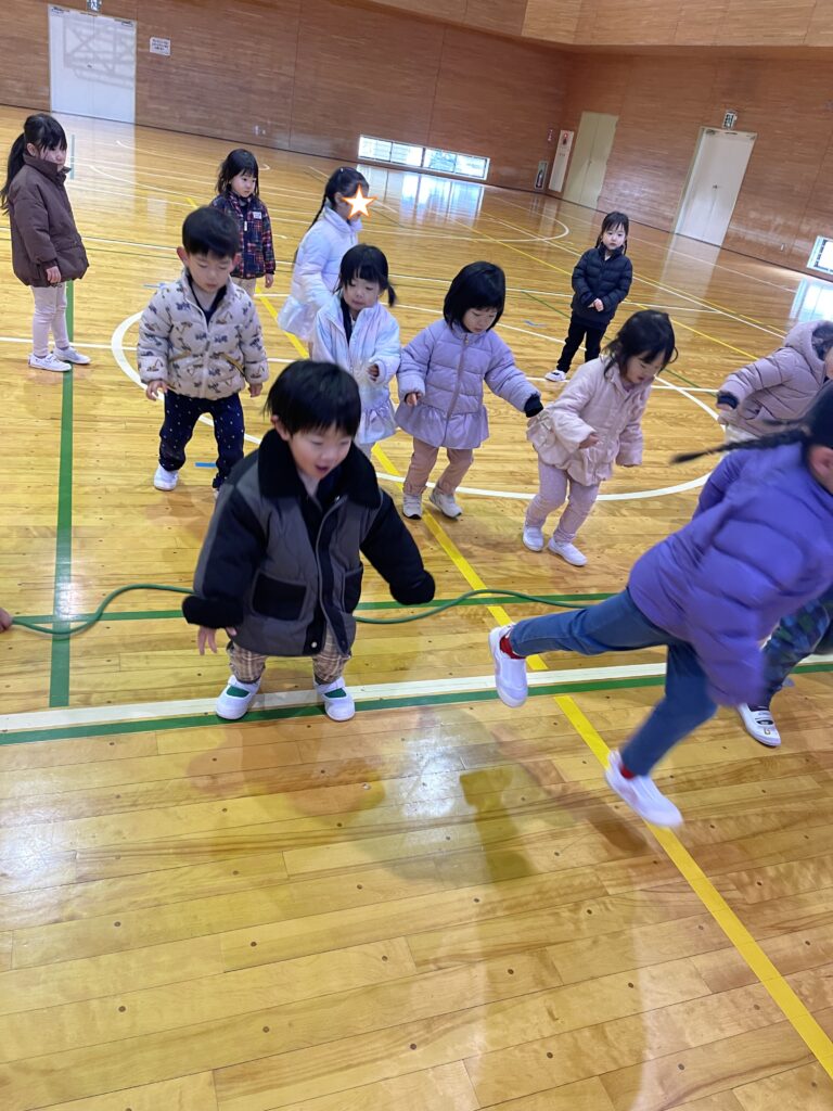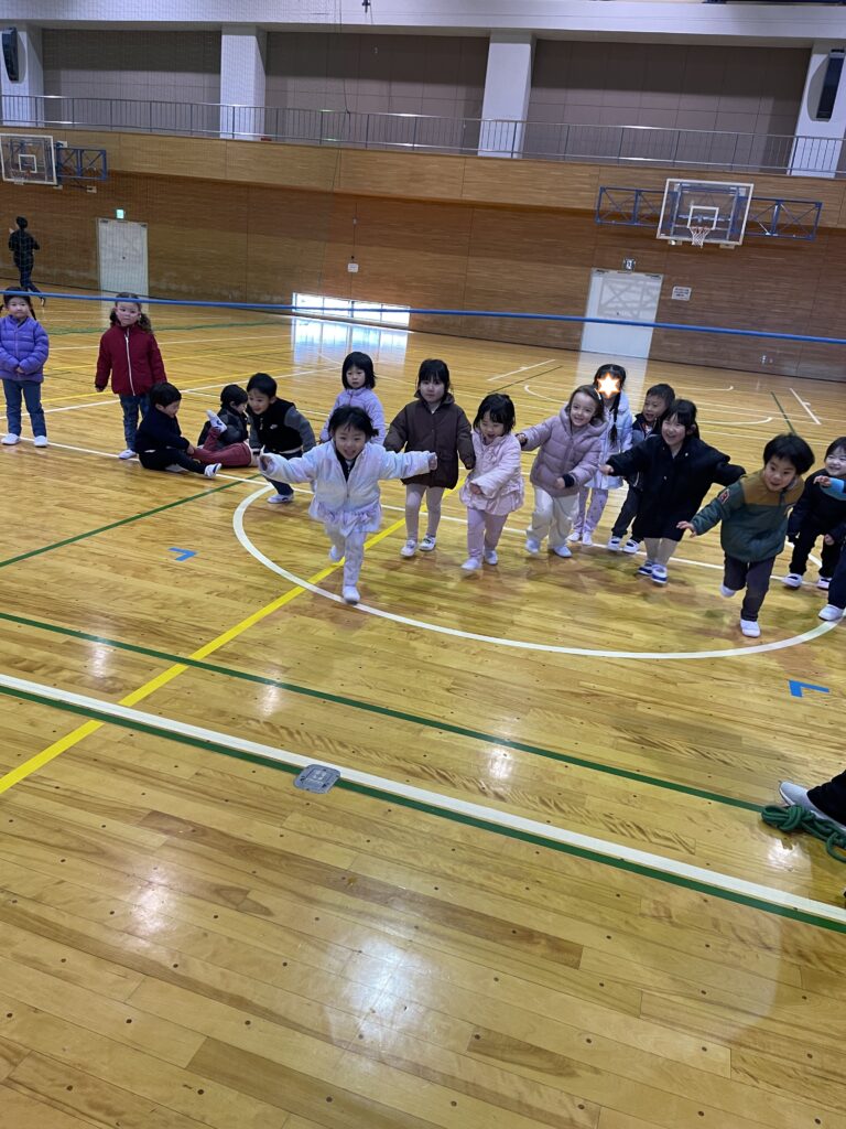 寒い中ですが、子どもたちは元気いっぱい身体を動かしました😊気温もぐっと下がったので、まずランニングで体をと温めてからストレッチを。縄跳びのアクティビティでは、昨年の干支のへびさん(大繩)を、今年の干支のお馬さんに変身して飛び越えたり、うさぎさんになったり、ピョンピョンと2回連続ジャンプをしたりと、いろいろな跳び方でとび越えました。