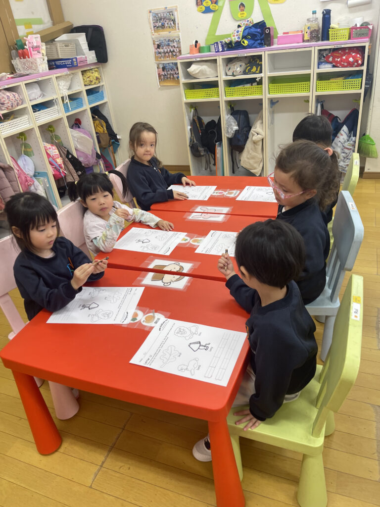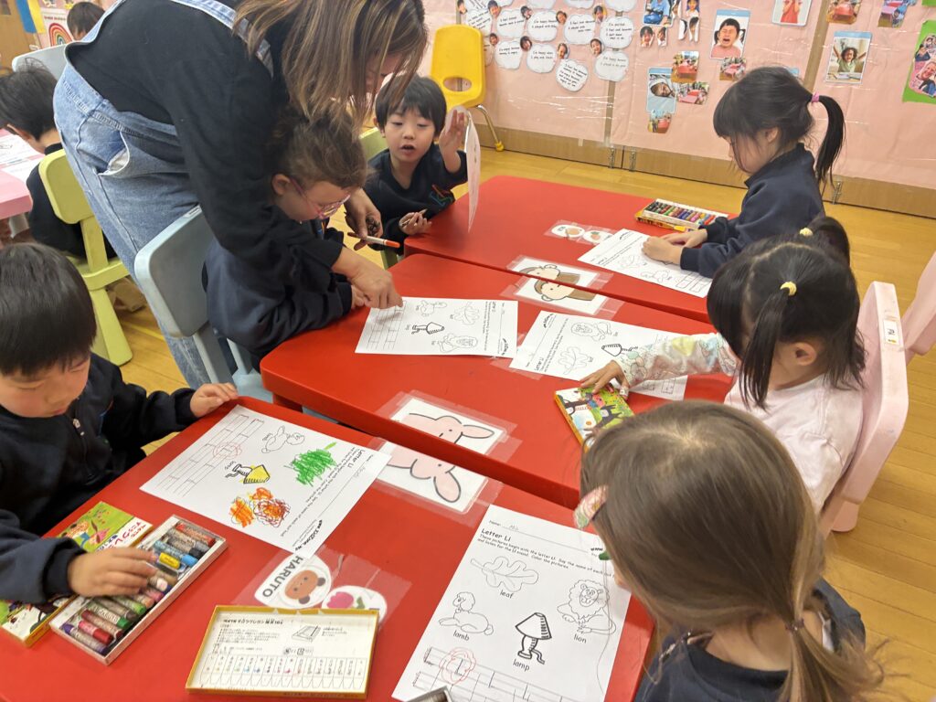 Writingレッスンでは、アルファベット「L」を学びました。ライオン、葉っぱ、ランプ、レモン、丸太など、Lで始まる音の練習をし、人差し指でお空にLの字を書いたり、おしりで書いたりしてみました!ワークシートでは、書き方鉛筆を使って鉛筆の持ち方を教わりながらLの字をなぞったり、クレヨンで絵に色を塗りました。鉛筆の正しい持ち方の練習も始まりました。お父さん指・お母さん指・お兄さん指の3本を使って、正しい持ち方ができるよう練習していきます。