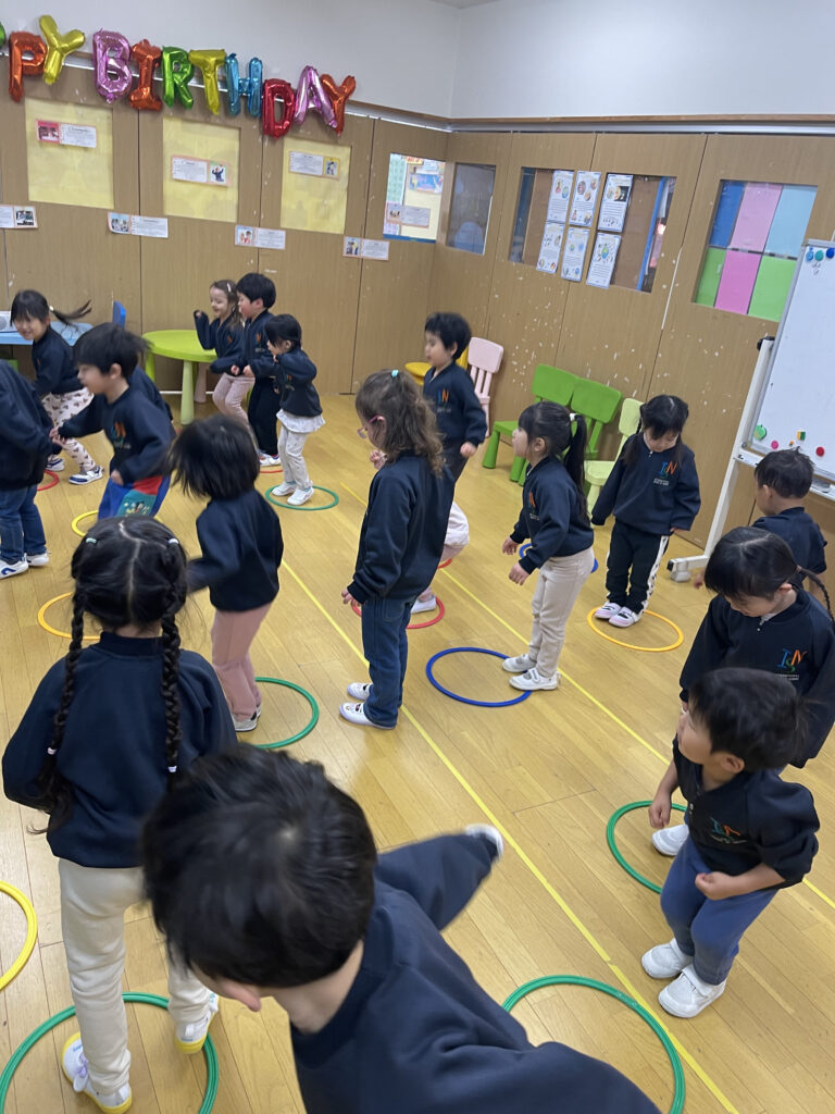 After the holiday, we wanted the children to regain their energy so they could stay active and keep warm as the temperature dropped. During the gym lesson, the gym was quite cold, so the students started by running and stretching. Ms. Airi then prepared a rope for the students to jump over. Through these activities, their bodies gradually warmed up.