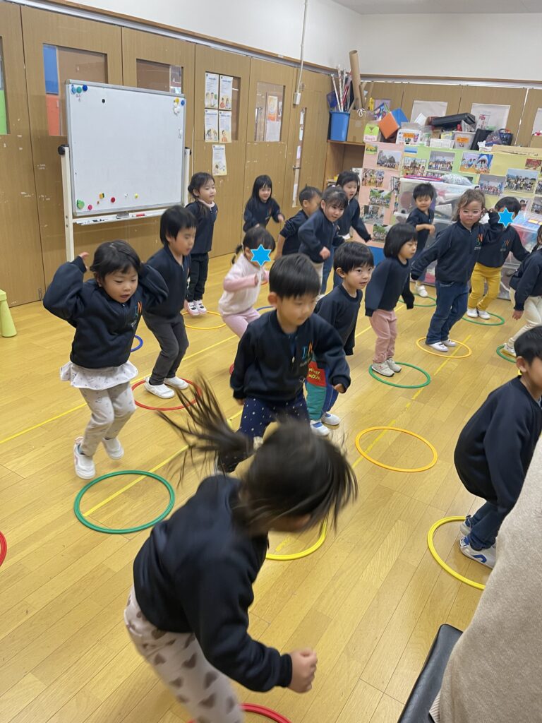 We had our first music lesson of the year. The students learned and sang a winter song in Japanese. They also tried a new activity using hoops, where they jumped in and out to the rhythm of the piano while counting how many jumps it took to move in and out of the hoops.