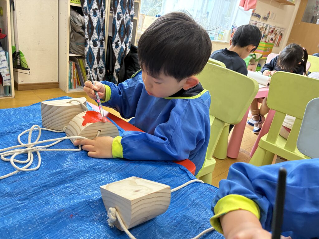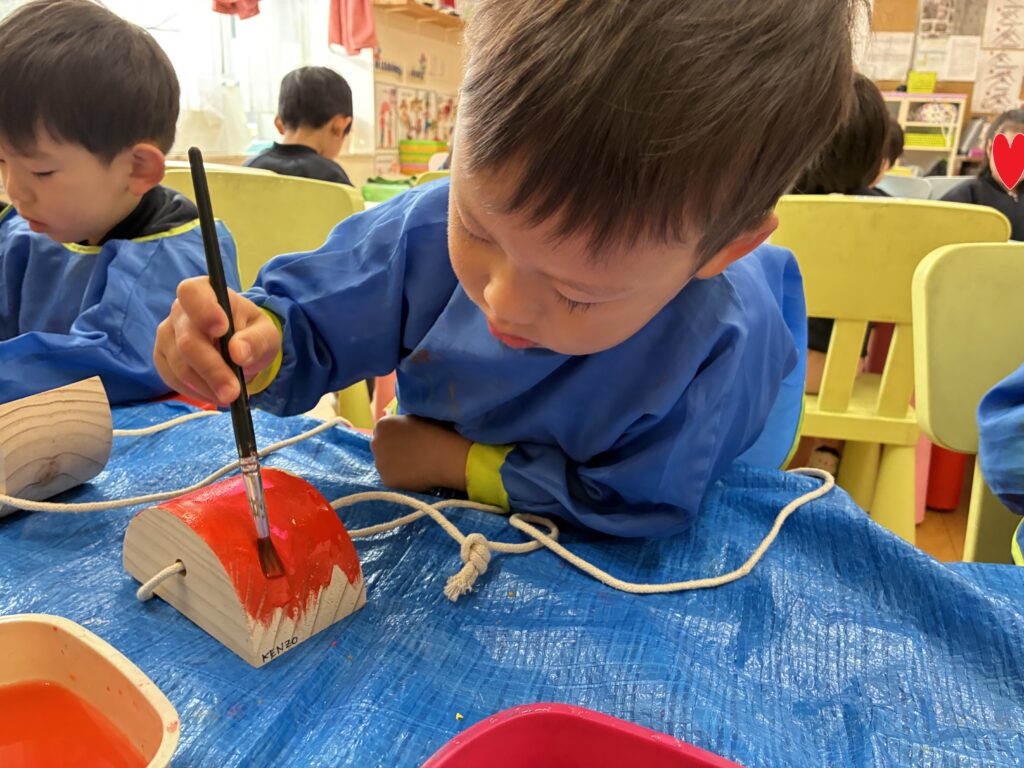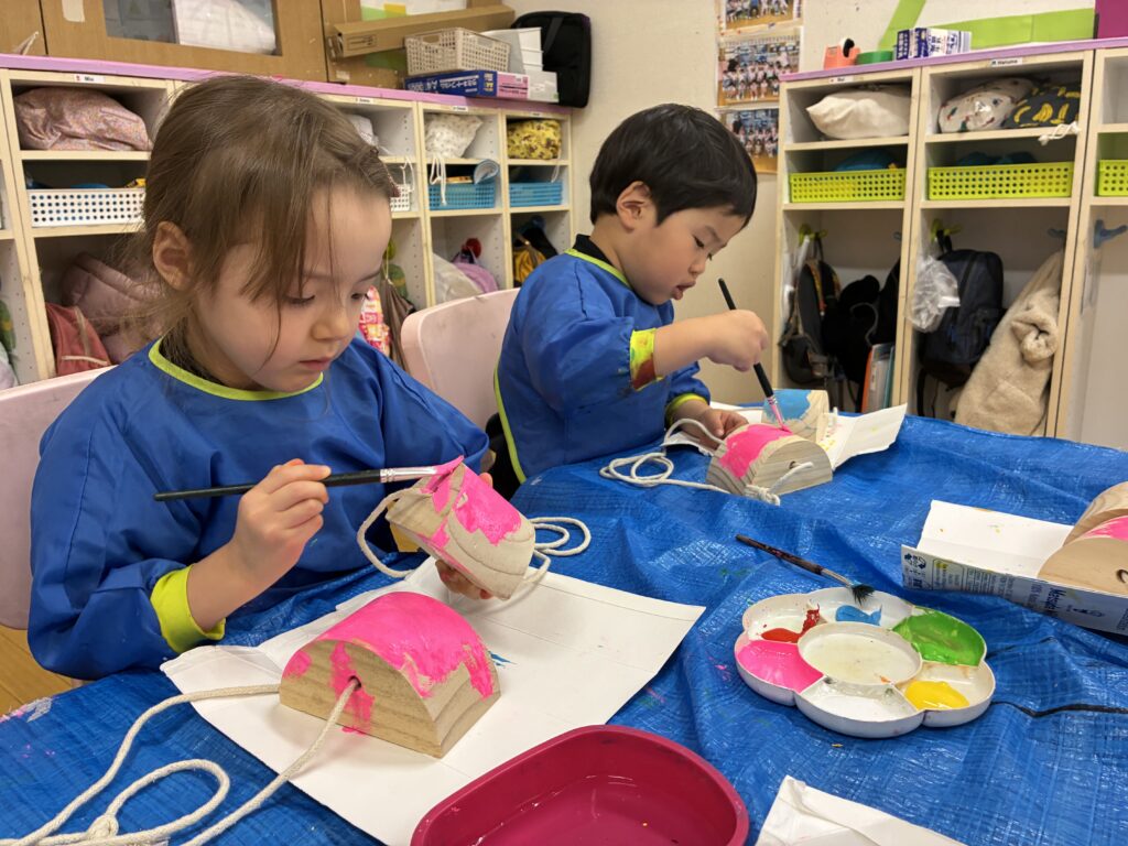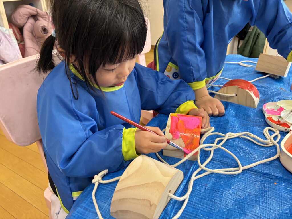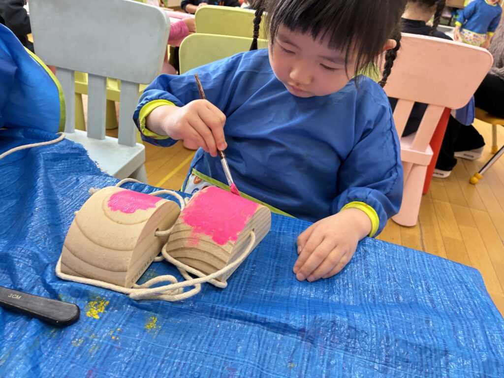 The students received pokkuri as a Christmas present. Before using them, we asked the students to paint them in their favorite colors. We hung them up to dry, and the students are excited to use them for outdoor play.