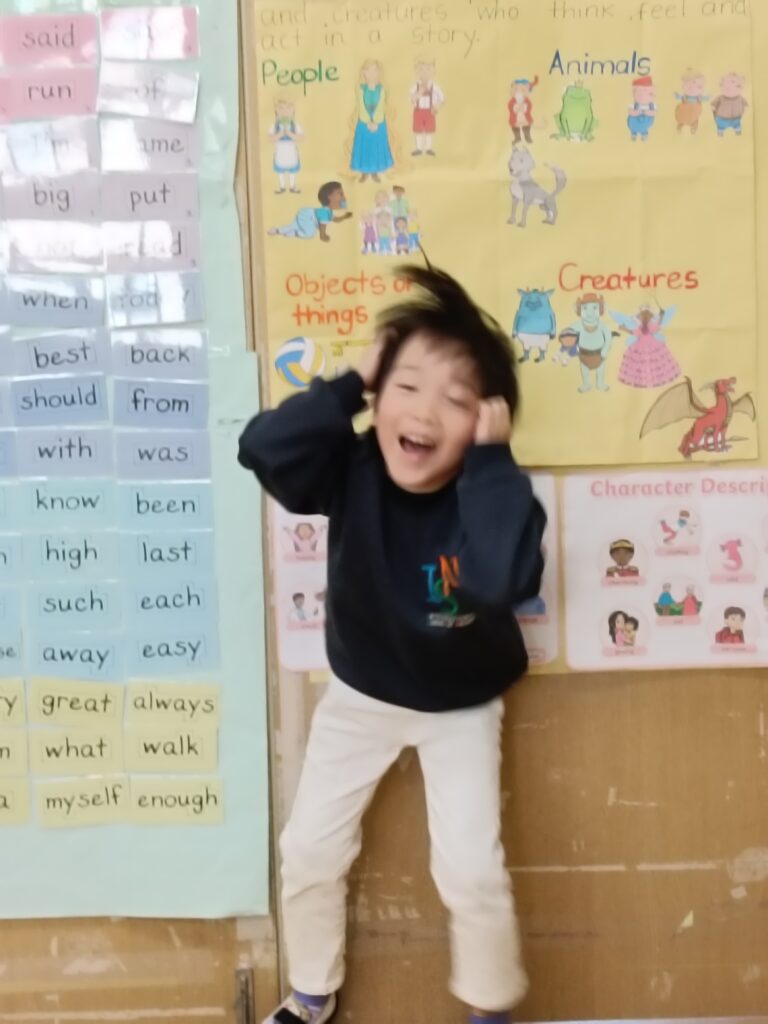 To wrap up this week’s exploration of story styles and how different types of feelings and emotions can be expressed in stories, they did an emotions charades. They had to guess the feeling or emotion their peers were acting out. Some of them said,”I think you are sleepy/bored”, “you look like you are excited”, “you are yawning so I think you are tired” and “are you scared?” These responses match the pictures below in chronological order.