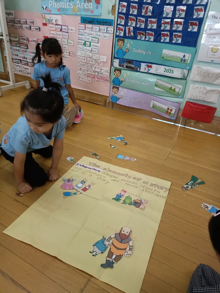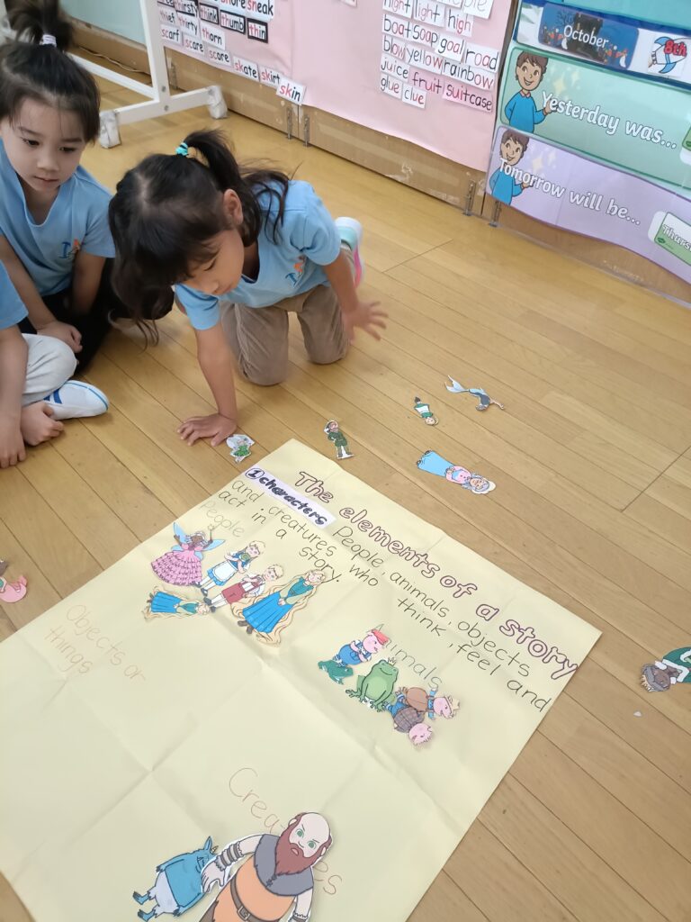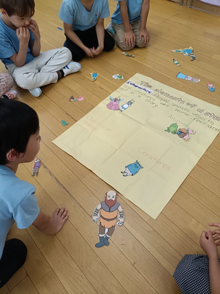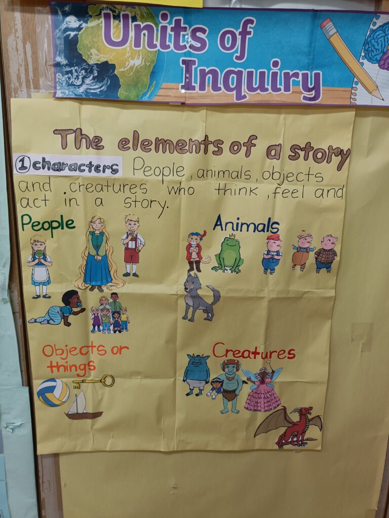 After everyone had a general idea of what the topic would be , we moved on to talking about the elements of a story . The first element we chose to talk about is CHARACTERS. We defined characters as the people,animals, objects/things and creatures who think, feel and act in a story.