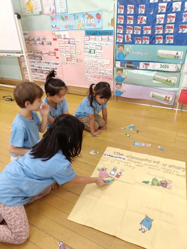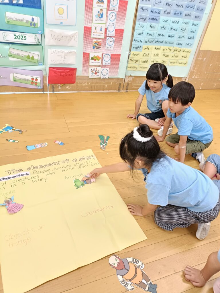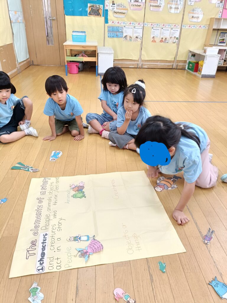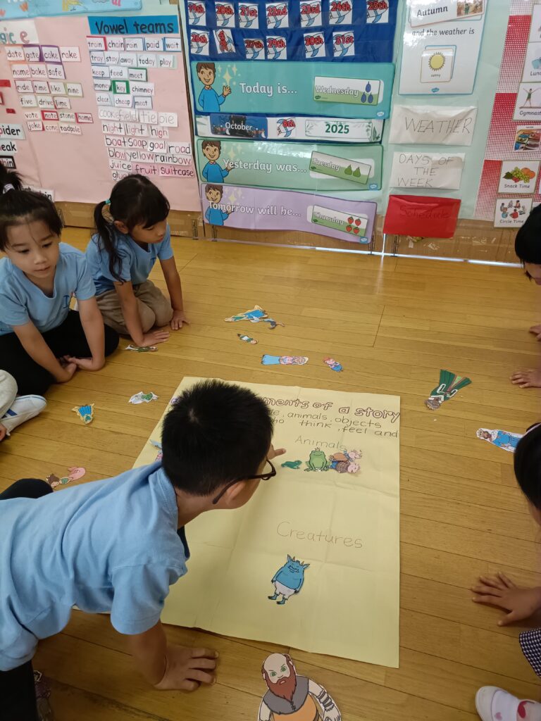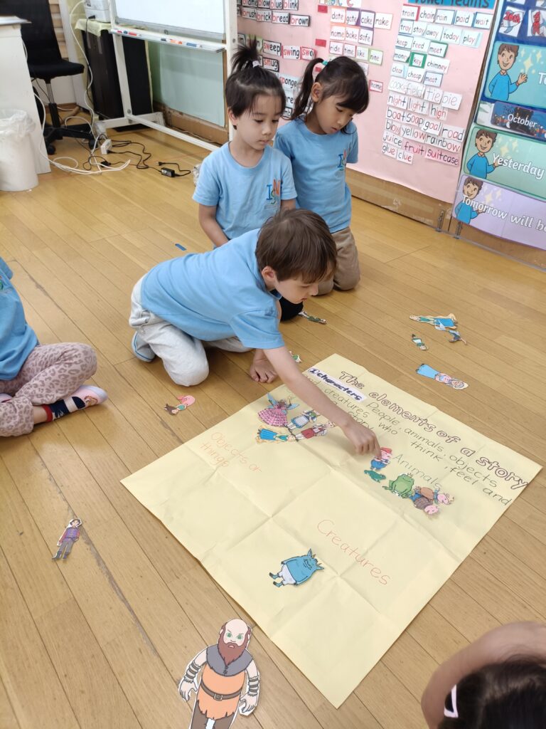 After everyone had a general idea of what the topic would be , we moved on to talking about the elements of a story . The first element we chose to talk about is CHARACTERS. We defined characters as the people,animals, objects/things and creatures who think, feel and act in a story.