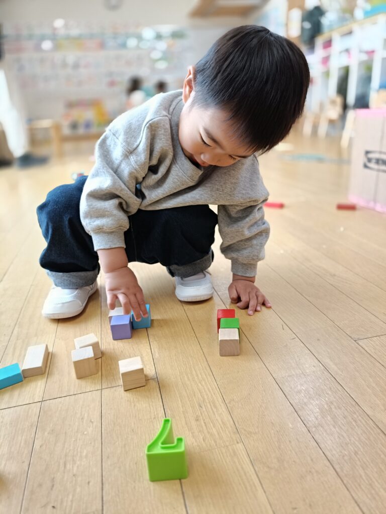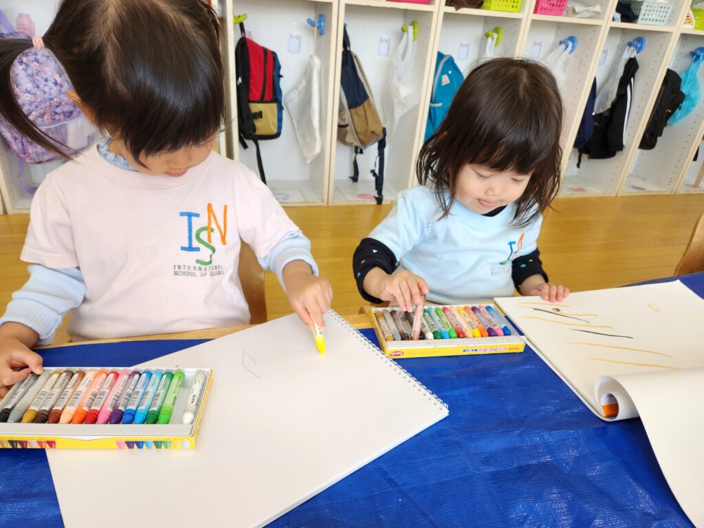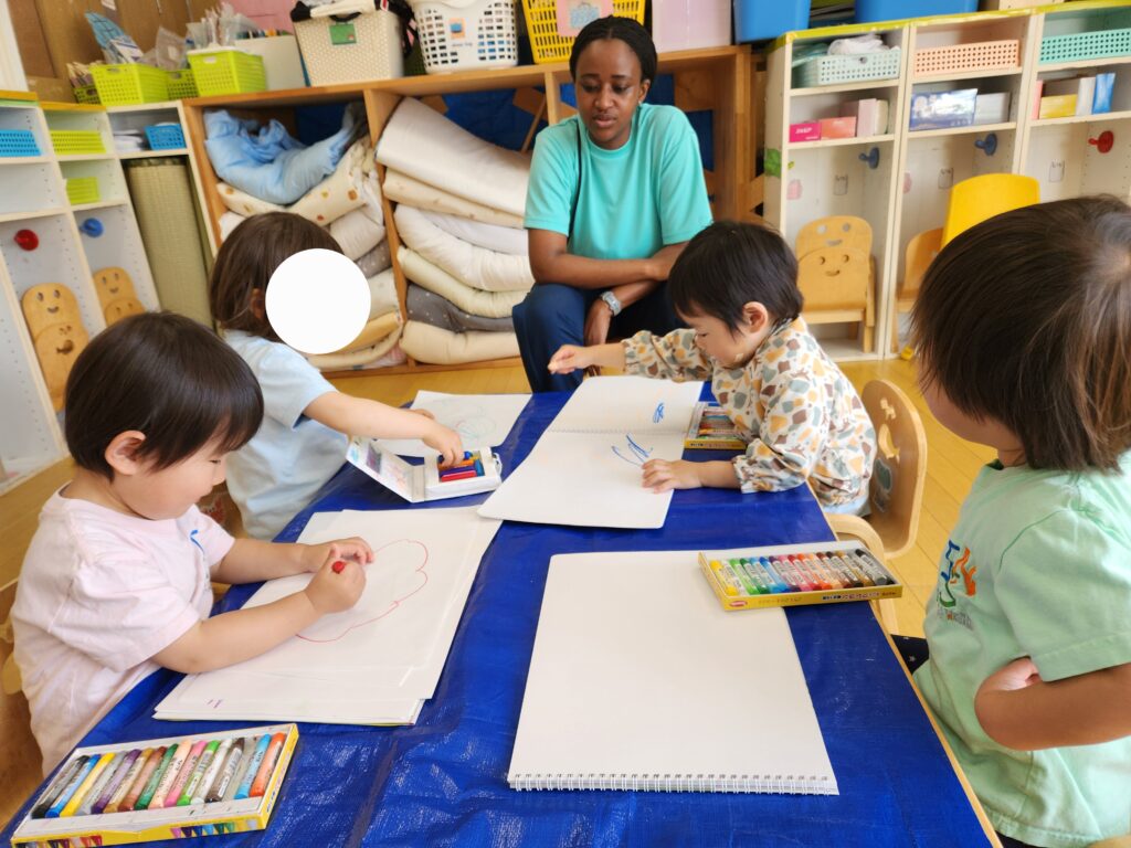 お絵描きの時間は、創造力と色であふれるひととき!子どもたちはクレヨンを選びながら、色の名前を言って楽しそうにお絵かきをしていました。「あか!」「あお!」「きいろ!」と、自分の選んだ色を誇らしげに教えてくれる声がたくさん聞こえてきました。