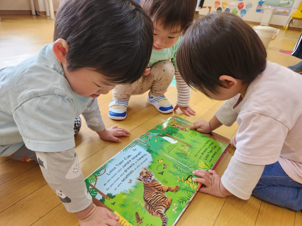 今月のテーマである「color」では、子どもたちが少しずつ自信をもって色を見分けたり、言えるようになってきました。赤いりんごや青い空など、さまざまな場面で色を見つけています。