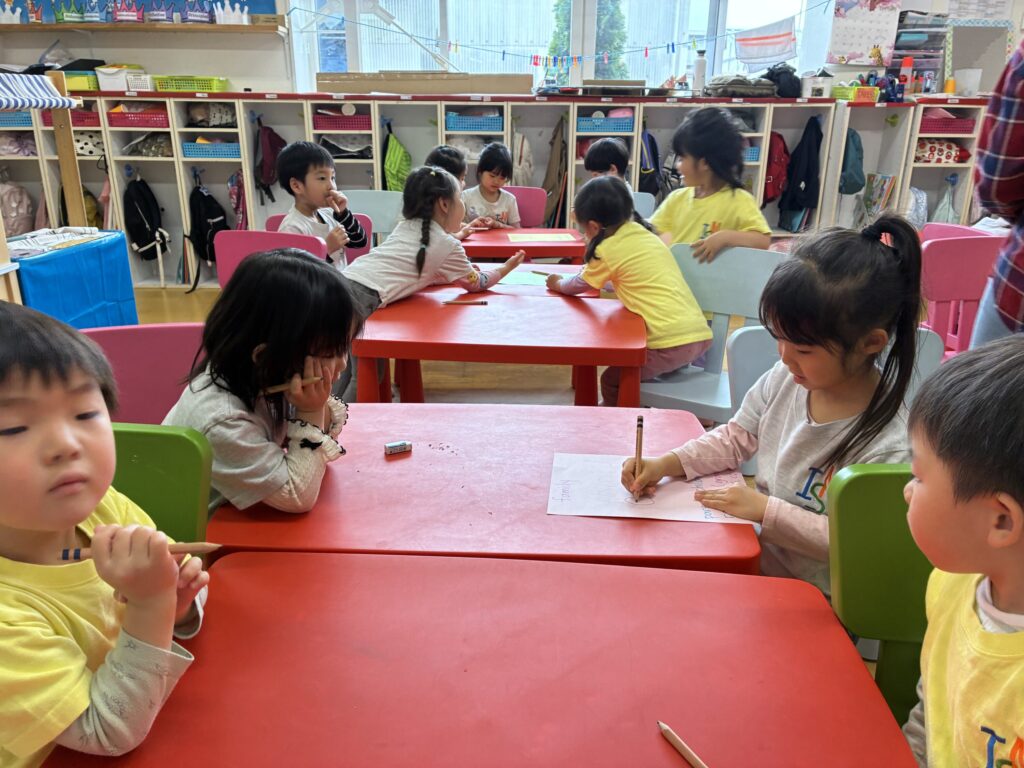 Shooting Starさんたちは、こどもの日のお祝いのために鯉のぼり作りを楽しみました。まずは、綾子先生の「こどもの日」のお話を聞きました。子どもたちはこのお話が大好きで、熱心に耳を傾けていました。鯉のぼりにはいろいろな色があるので、好きな色を選びました。それぞれの色は、UOIのレッスンにつながる家族の一員を表しています。鯉のぼりの色には特定の意味があり、伝統的に黒い鯉は父親、赤やピンクの鯉は母親、その他の色の鯉は子供を表しています。鯉の体の部分を様々な形に切り抜き、糊で貼り付け、飾り付けをして、美しい鯉のぼりを作り上げました😍。