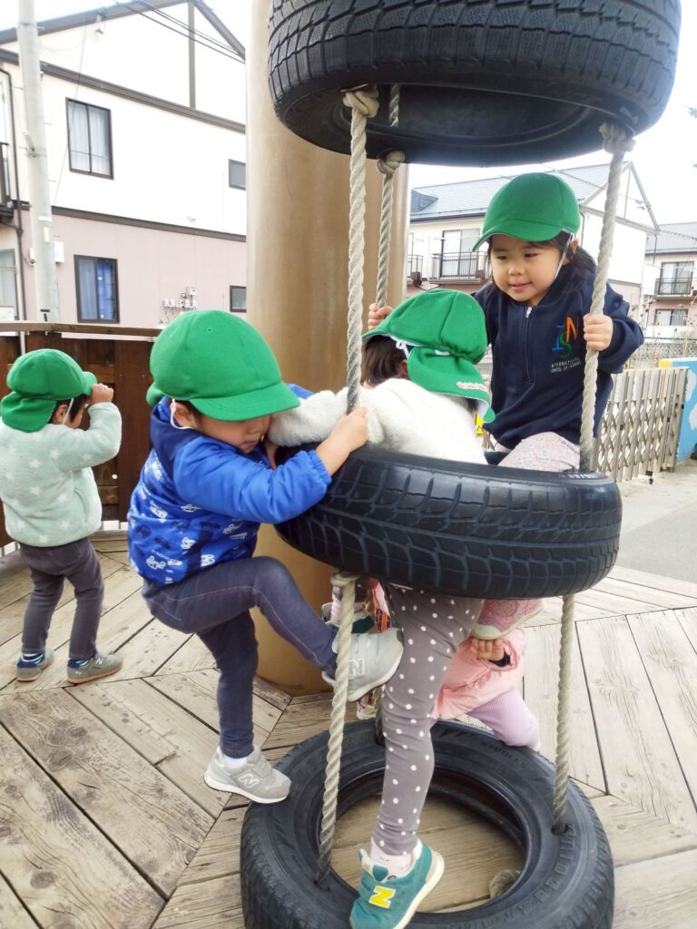 その後の外遊び中、タイヤ登りに苦戦していた子がコツコツ練習し、足をかけタイヤ登りができるようになりました。「努力を重ねれば、できる事はどんどん増えていく」英語も同じですね。
