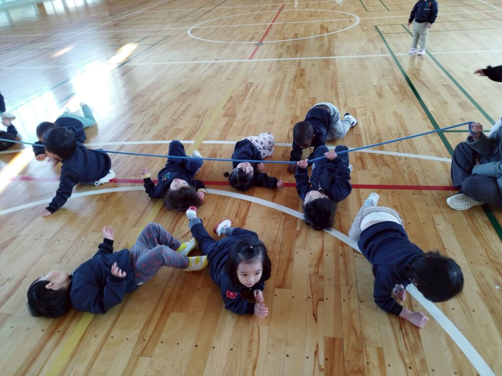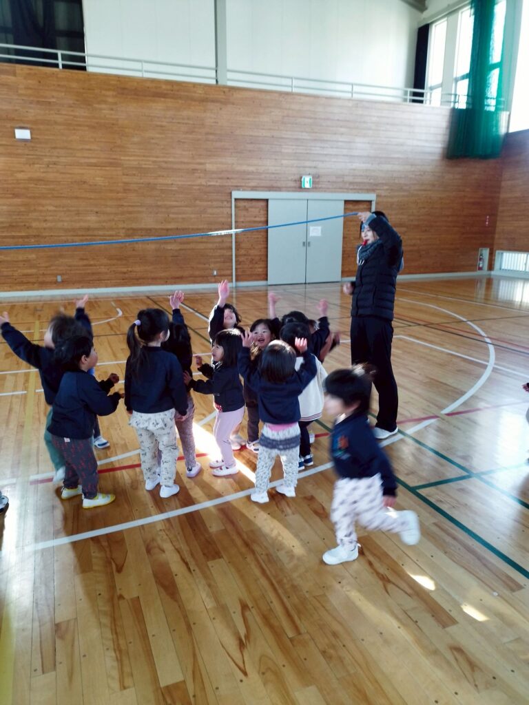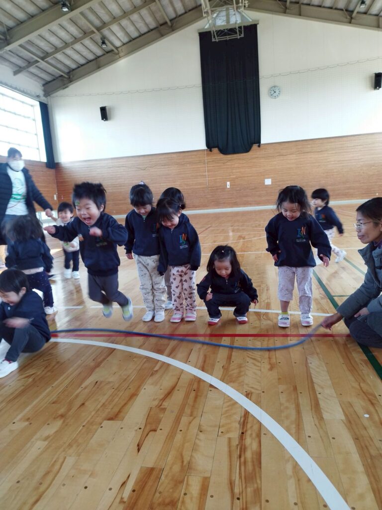 水曜日は準備運動の後、初めて長縄に挑戦しました。長縄ジャンプの上をジャンプしたり、くぐったり、高いところ長い縄をジャンプでタッチ!夢中でジャンプする子ども達でした。