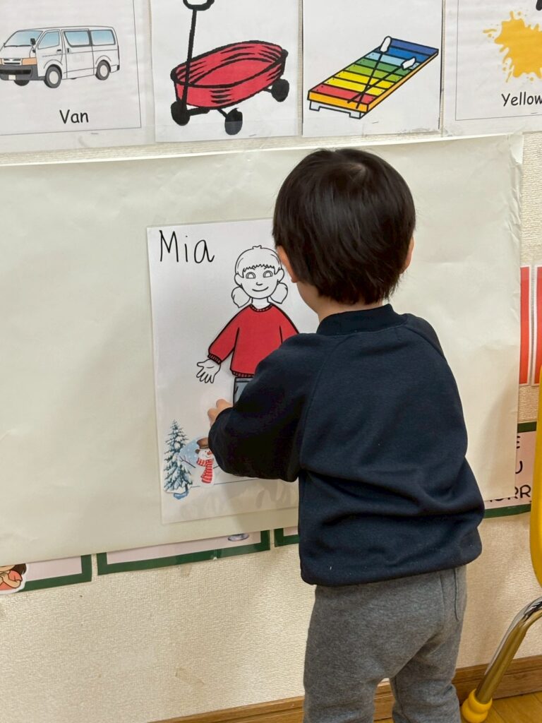 子どもたちは、一週間、全力で学んだり遊んだりして過ごし、お昼寝の時間には体を休め、午後のサークルタイムには、クイズやリズミカルなアクティビティを通して、今月のテーマである「衣服」について学びました。