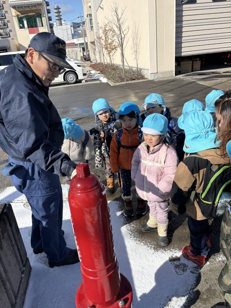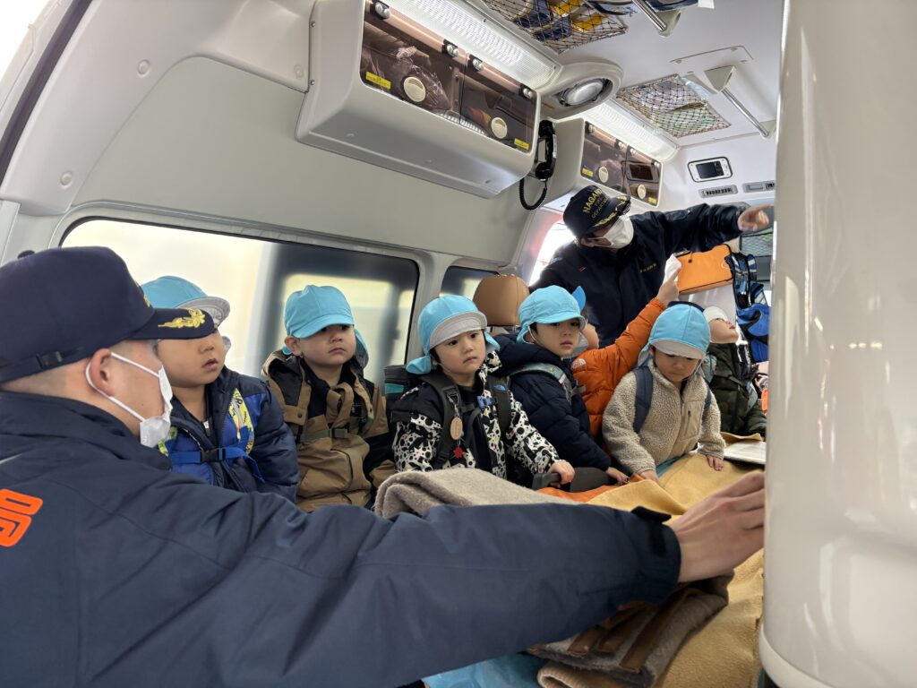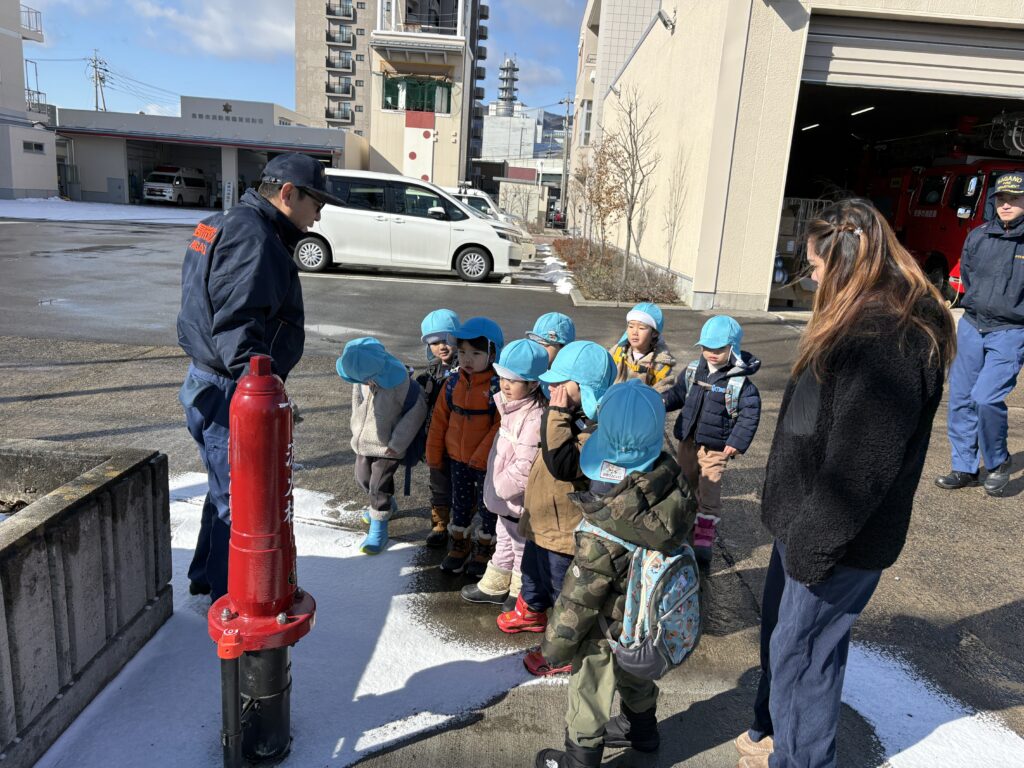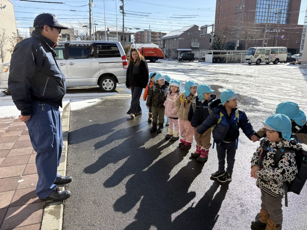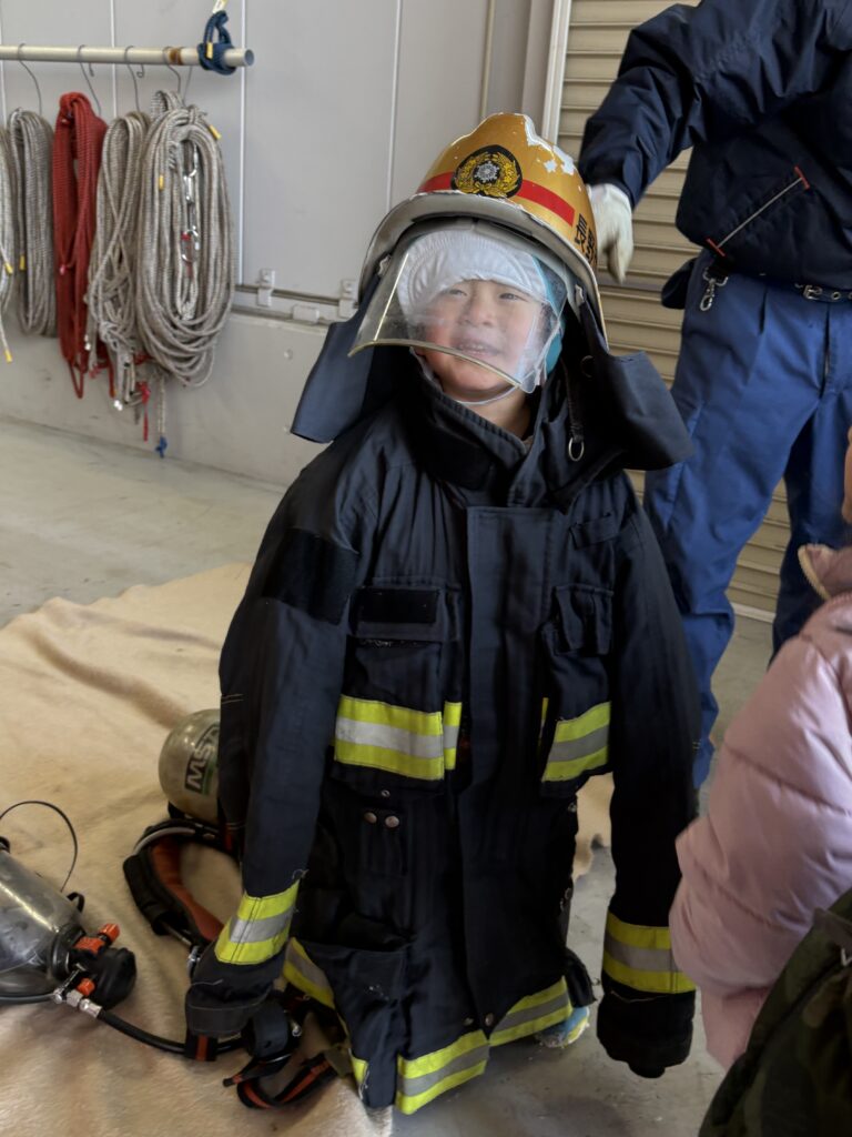 The highlight for many was the big ladder truck, called the Hashigousha. We learned that the “L15” on the front shows the length of its ladder, and that there are different types of ladder trucks used in different areas. The children asked thoughtful questions, shared ideas, and showed real enthusiasm for learning.