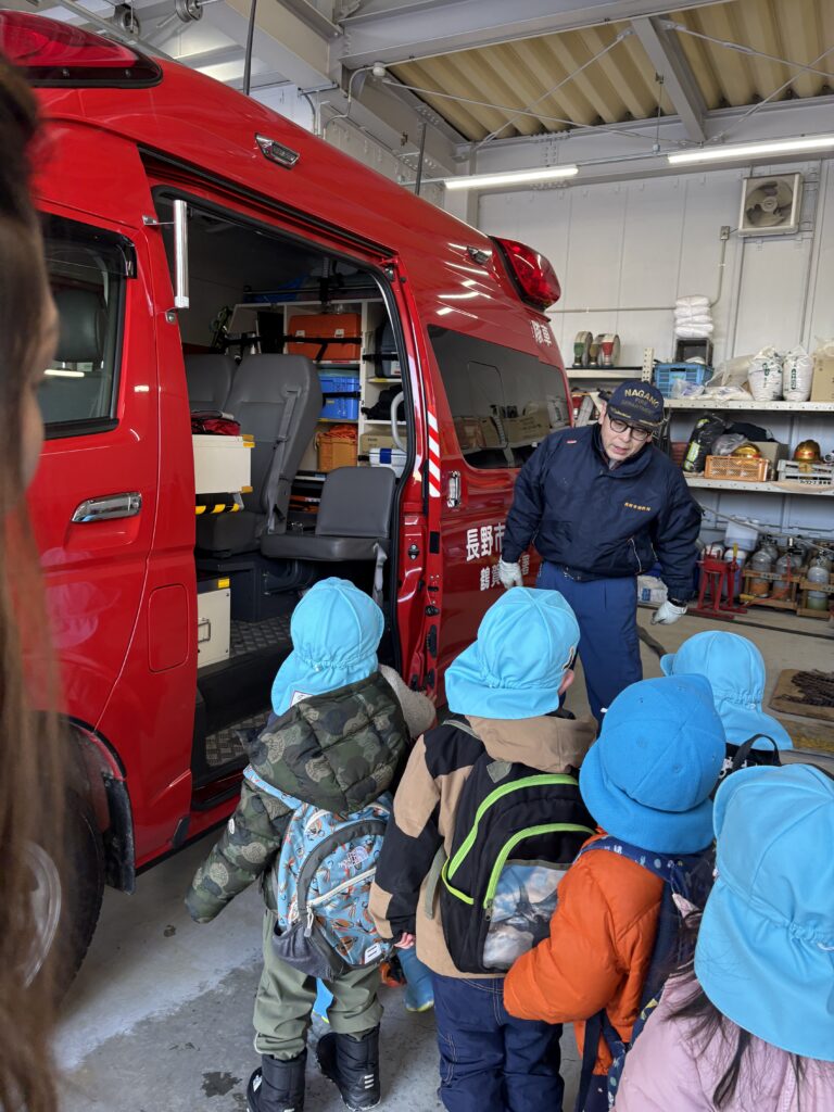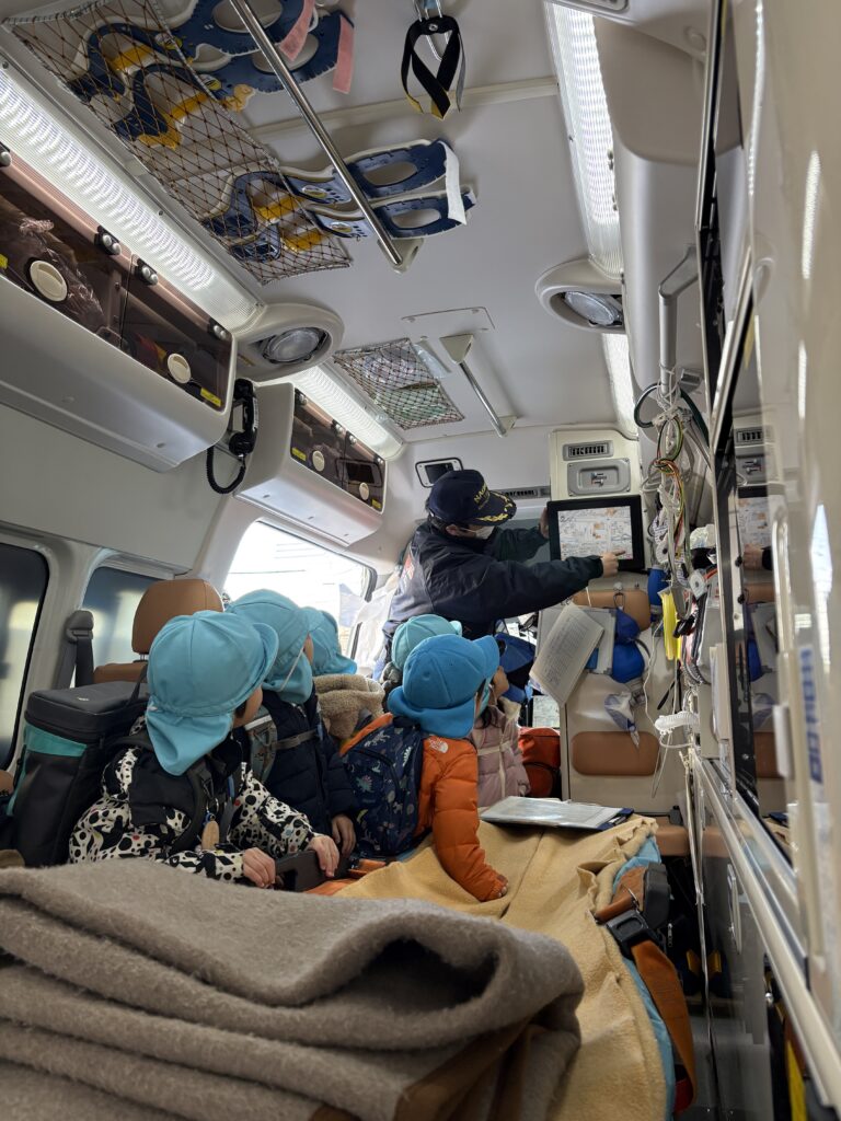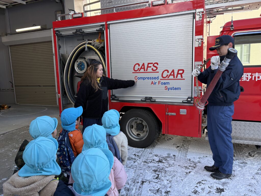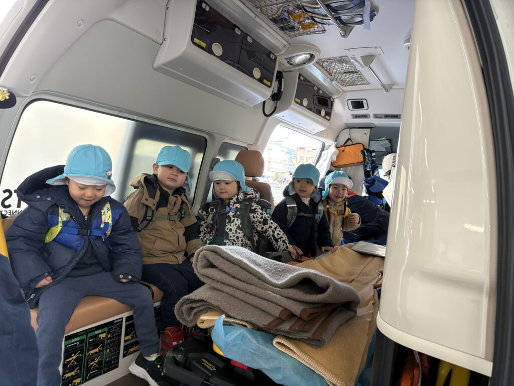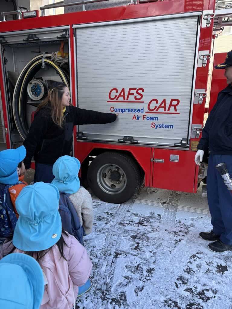 Our visit was packed with discoveries! We explored an ambulance and learned about the important tools used to help people in emergencies. We also watched a small fire engine in action and examined the equipment it carries. When we noticed a red van behind the truck, one student excitedly said, “That’s the Shikisha! (command vehicle)” What a great example of sharing prior knowledge and making connections!