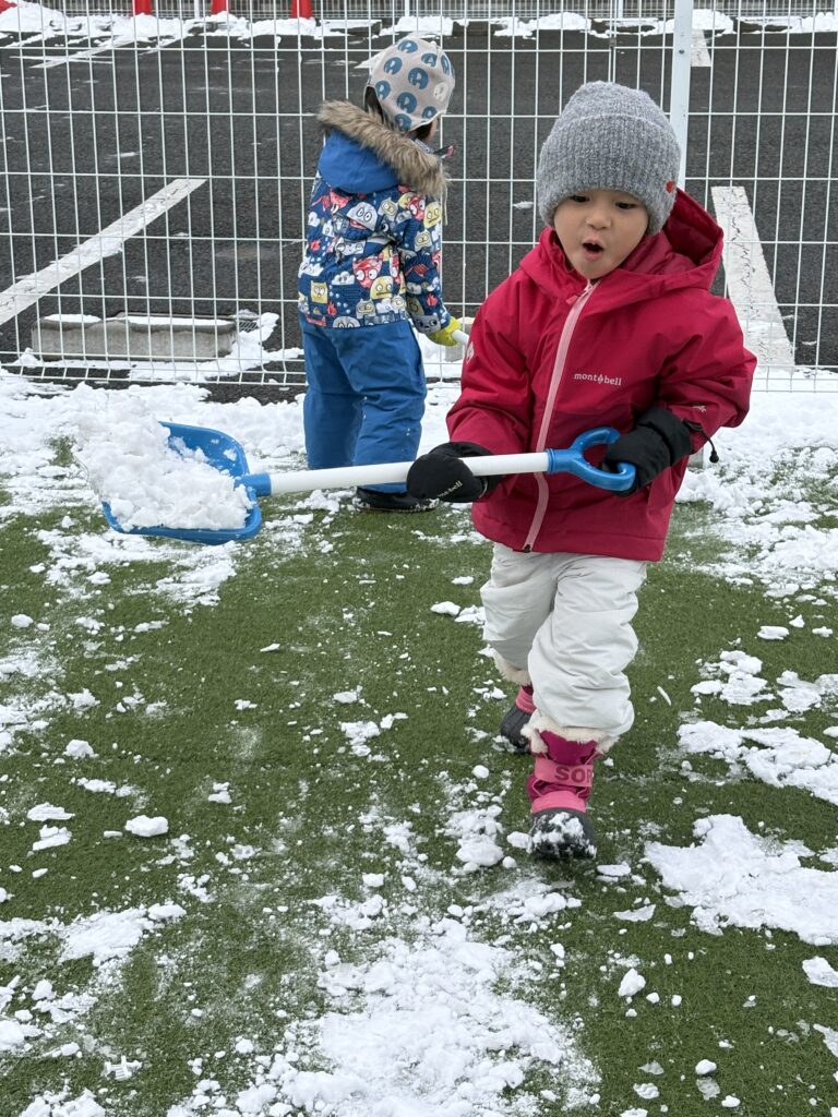 There was lots of teamwork too! Friends helped each other carry scoops of snow, shared tools, and talked about what they were making. Some of us pretended they were cooking snowy “soups” and ice cream while others worked together to build small snow piles and explore footprints in the snow.