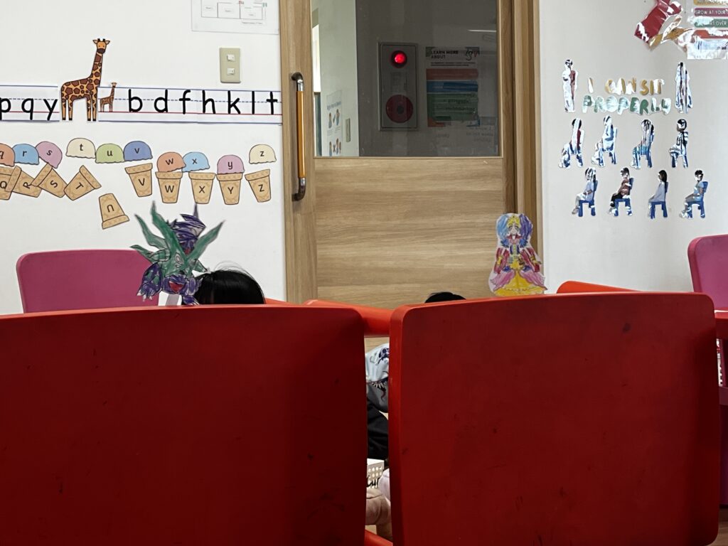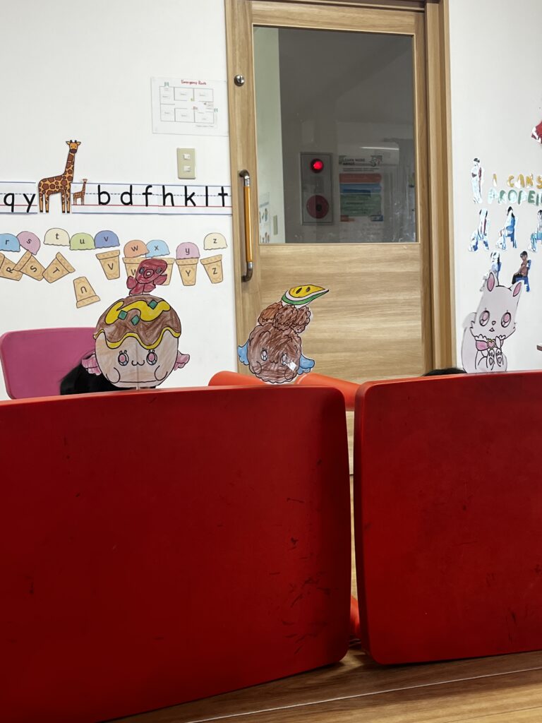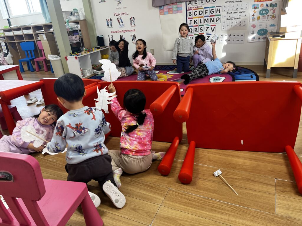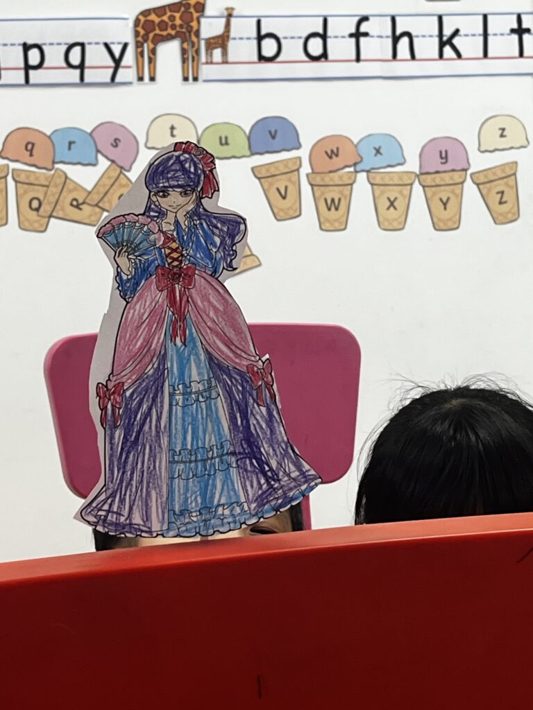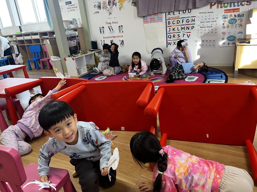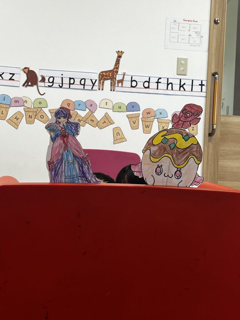 To begin the show, the children flipped the tables down, hid behind them, and prepared their “stage.” Their classmates gathered quietly in front, excited and ready to watch. With bright smiles and lively voices, the young performers presented their own original stories, full of imagination, humor, and teamwork.