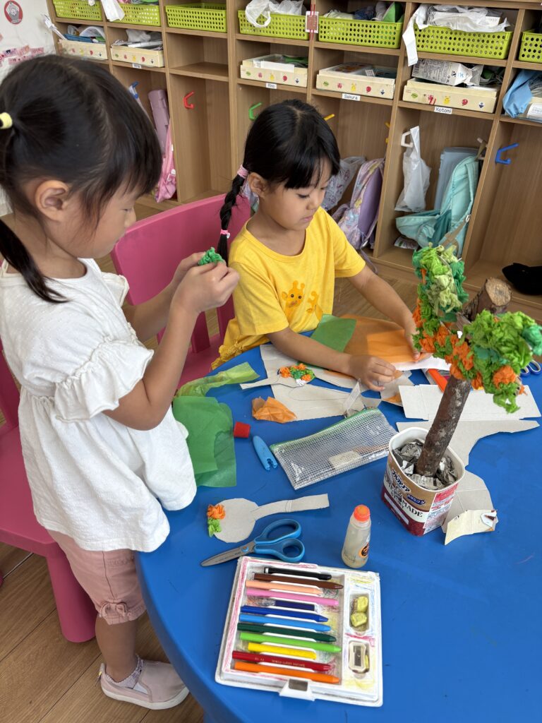 To bring our learning to life, we created our very own tree diorama! Using a real tree branch as the trunk, the children added colored tissue paper to make leaves, branches, flowers, and even fruits. Everyone worked carefully and creatively, turning simple materials into a beautiful, realistic tree model.