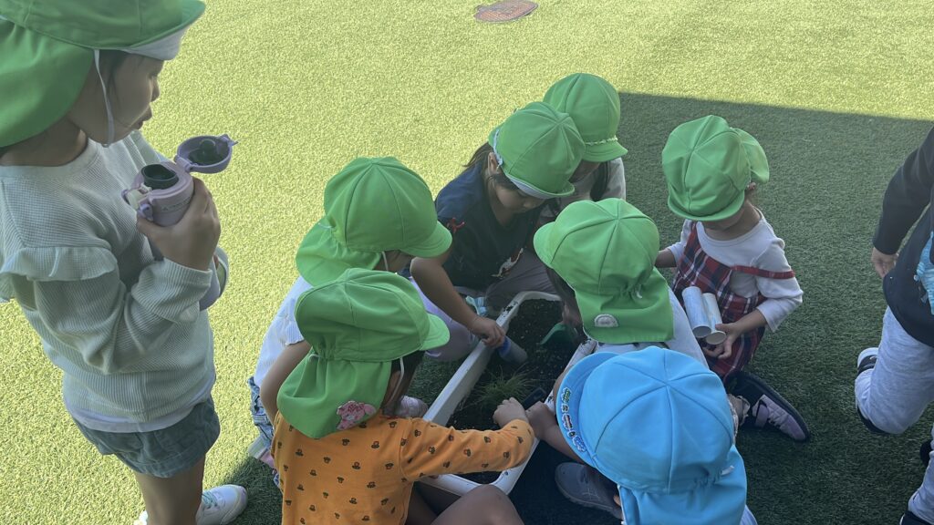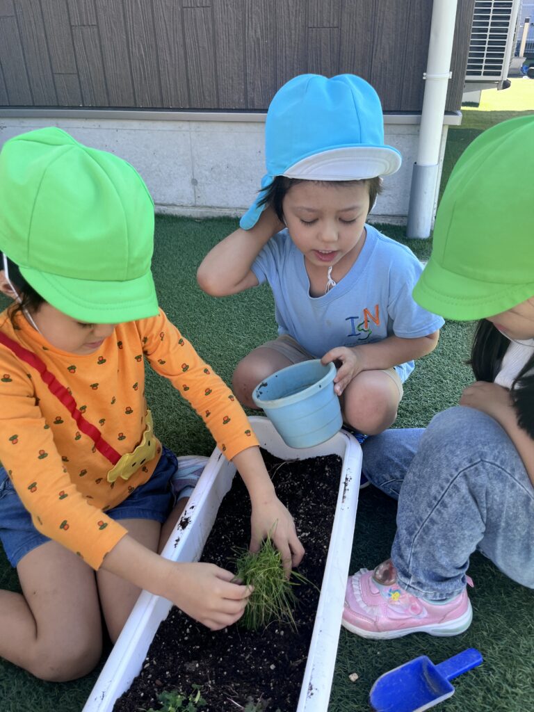 To add to our plant exploration, we also planted Nobi Nobi-kun in a planter outside! The children were so excited to see how much he had grown. We noticed that his roots were already coming out, which means he needed more space to grow strong and healthy.