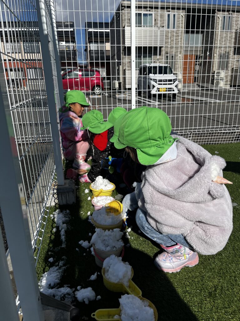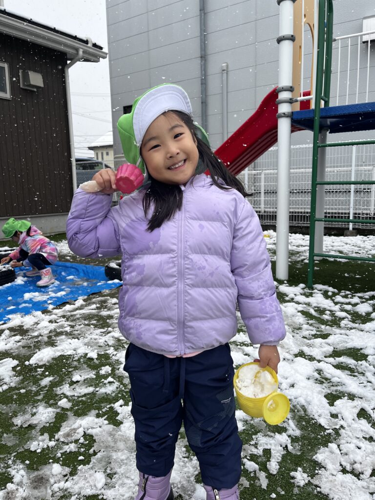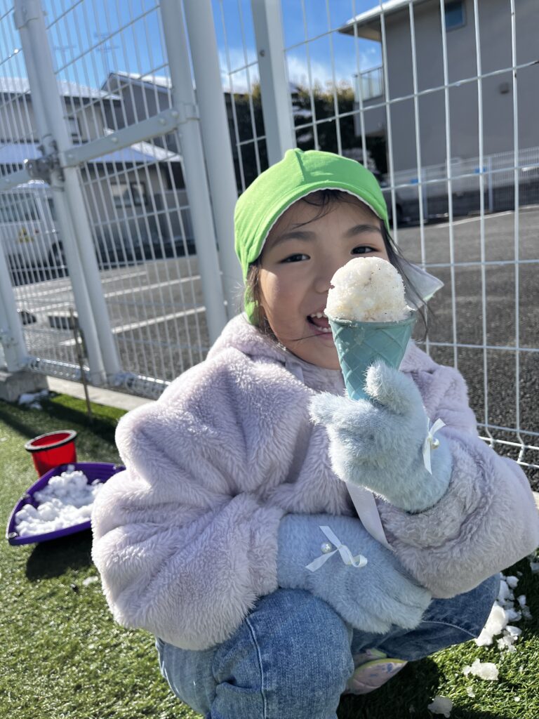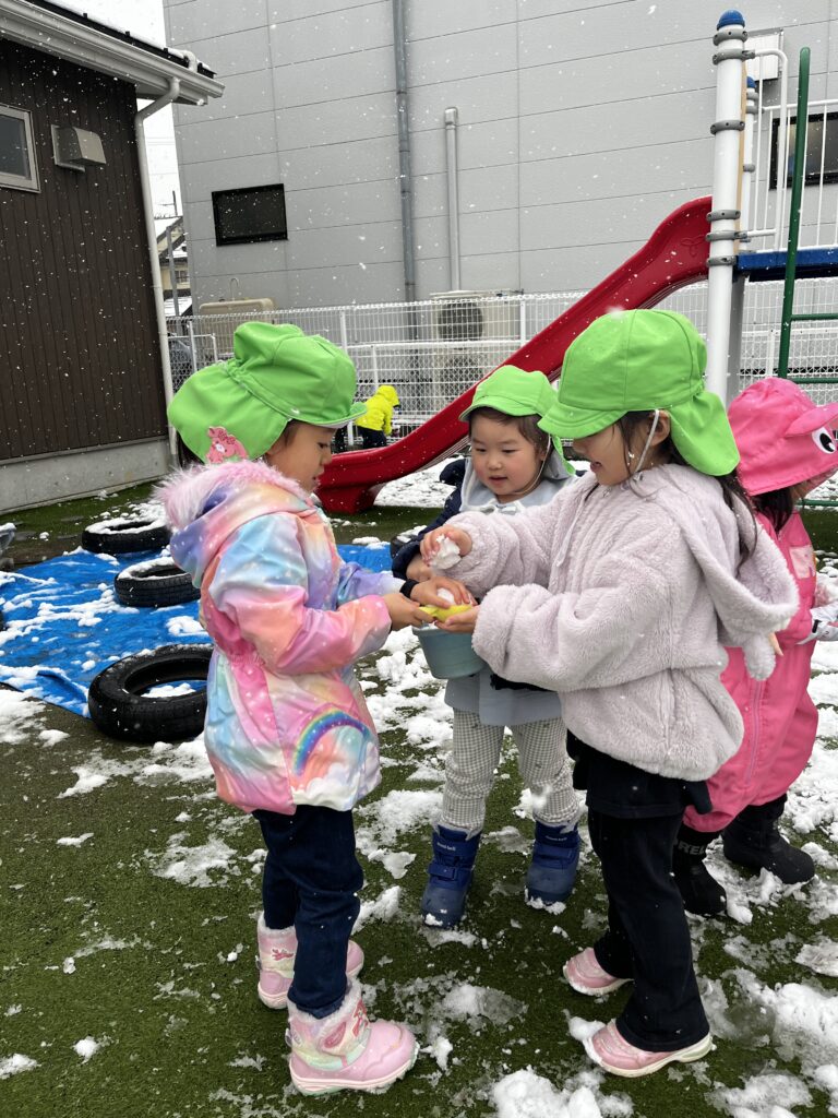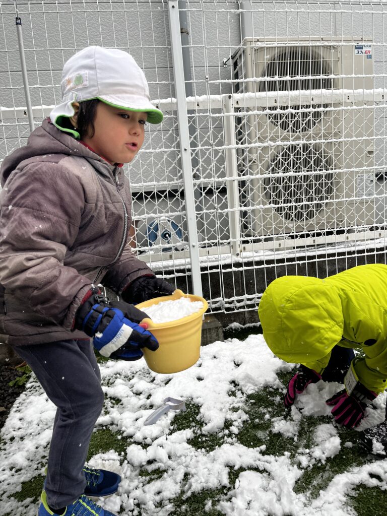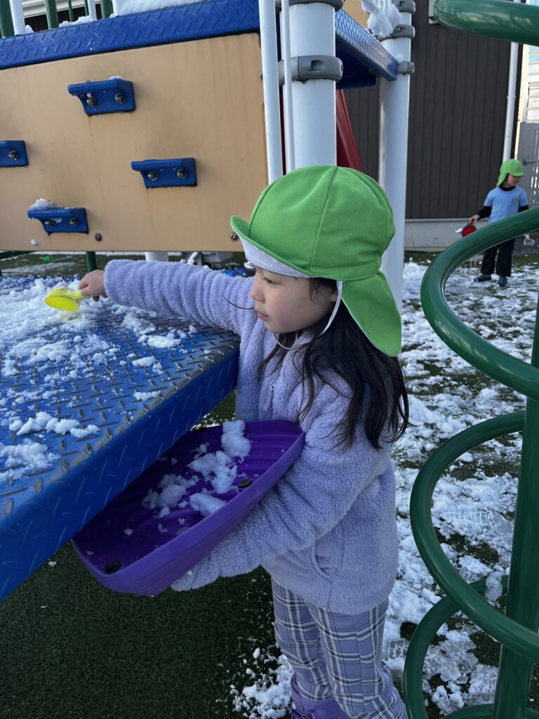 Although the snow did not pile up because it was wet and slowly melted, the children were still full of excitement. They enthusiastically played outside, building their snowmen and even opening their own imaginative “shaved ice shop” in the playground. Some children worked together to shape their snowy creations, while others delighted in scooping and molding the snow into pretend treats. Of course, many simply loved the pure joy of running freely around the playground, leaving trails of tiny footprints behind them.