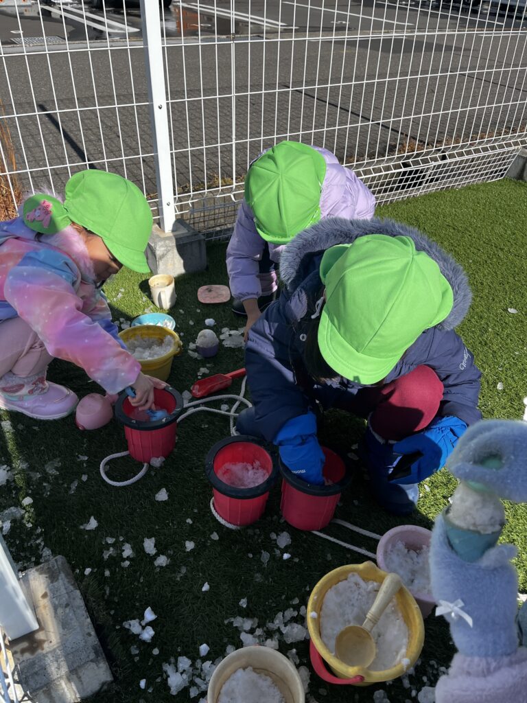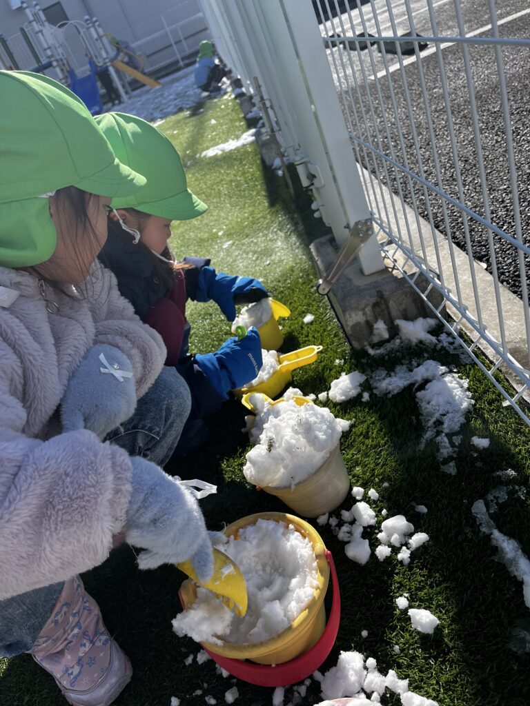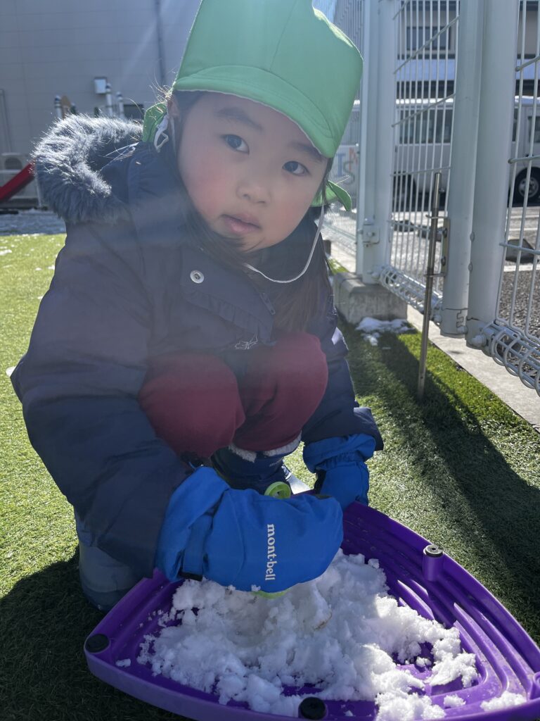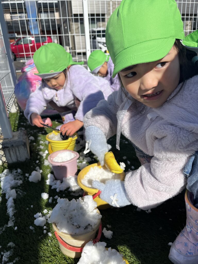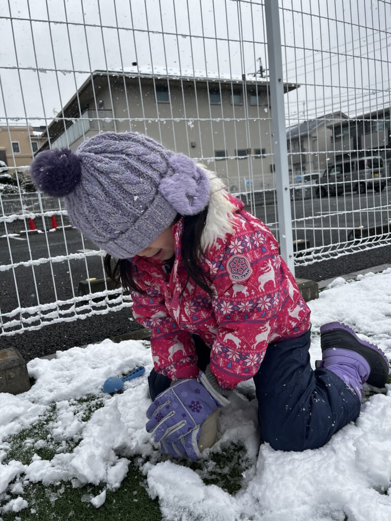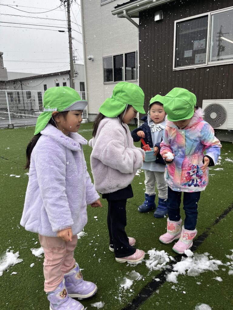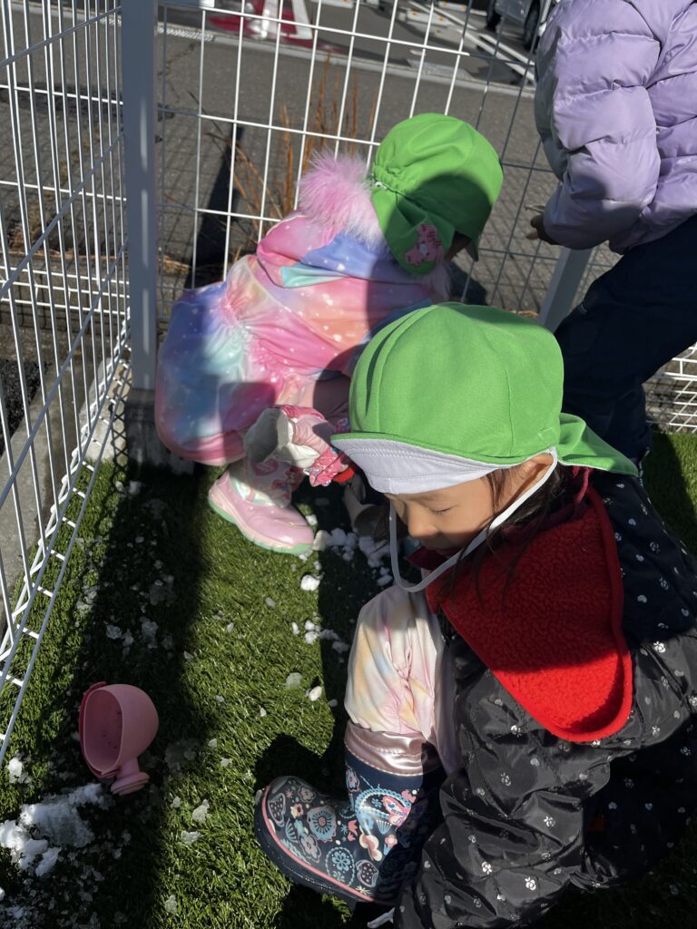 Although the snow did not pile up because it was wet and slowly melted, the children were still full of excitement. They enthusiastically played outside, building their snowmen and even opening their own imaginative “shaved ice shop” in the playground. Some children worked together to shape their snowy creations, while others delighted in scooping and molding the snow into pretend treats. Of course, many simply loved the pure joy of running freely around the playground, leaving trails of tiny footprints behind them.