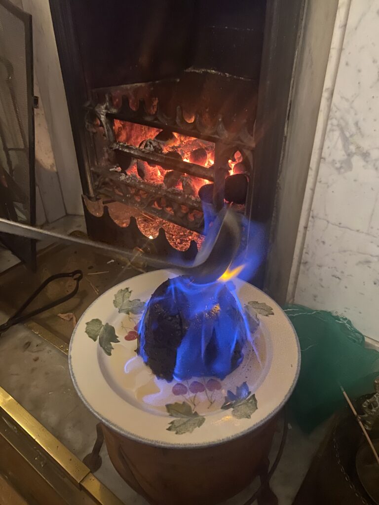 A rich, fruity dessert made with dried fruits, spices, and brandy. Traditionally prepared weeks — or even months — in advance. On Christmas Day, it’s warmed, drizzled with brandy, and set alight with a magical blue flame! Some families even hide a lucky silver coin inside. The image below is a real picture of my families christmas pud from last year!