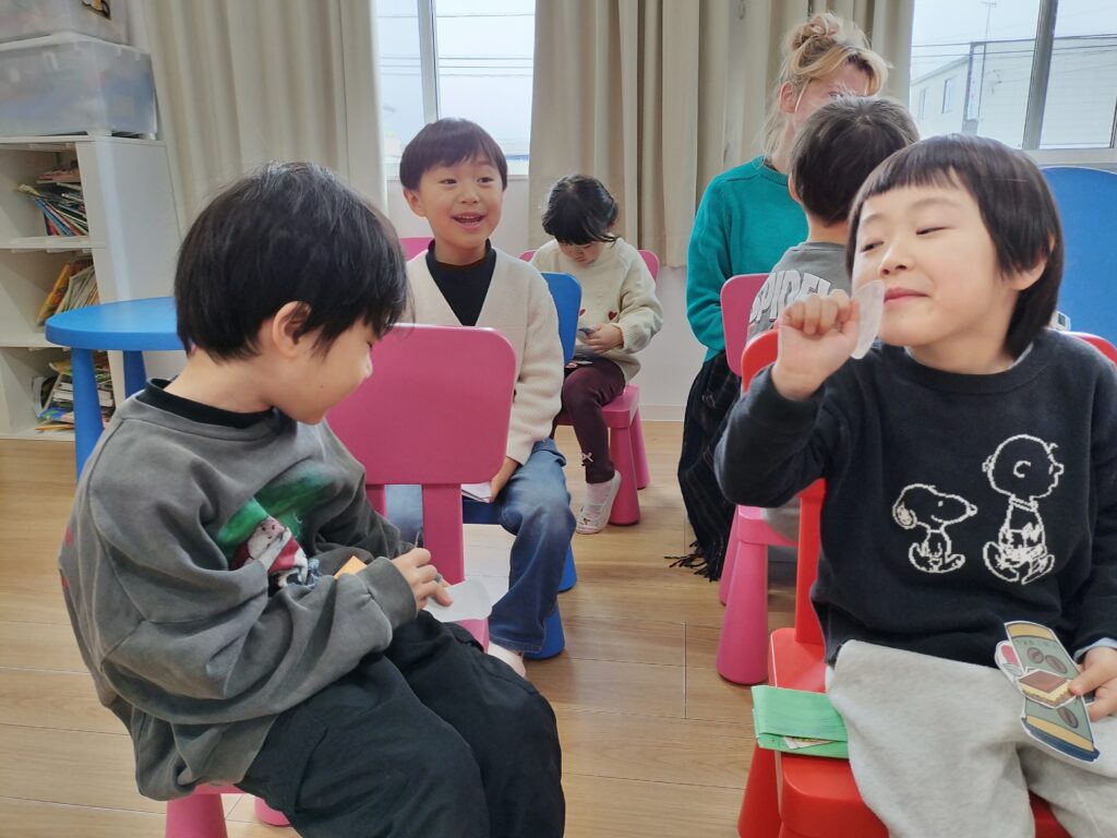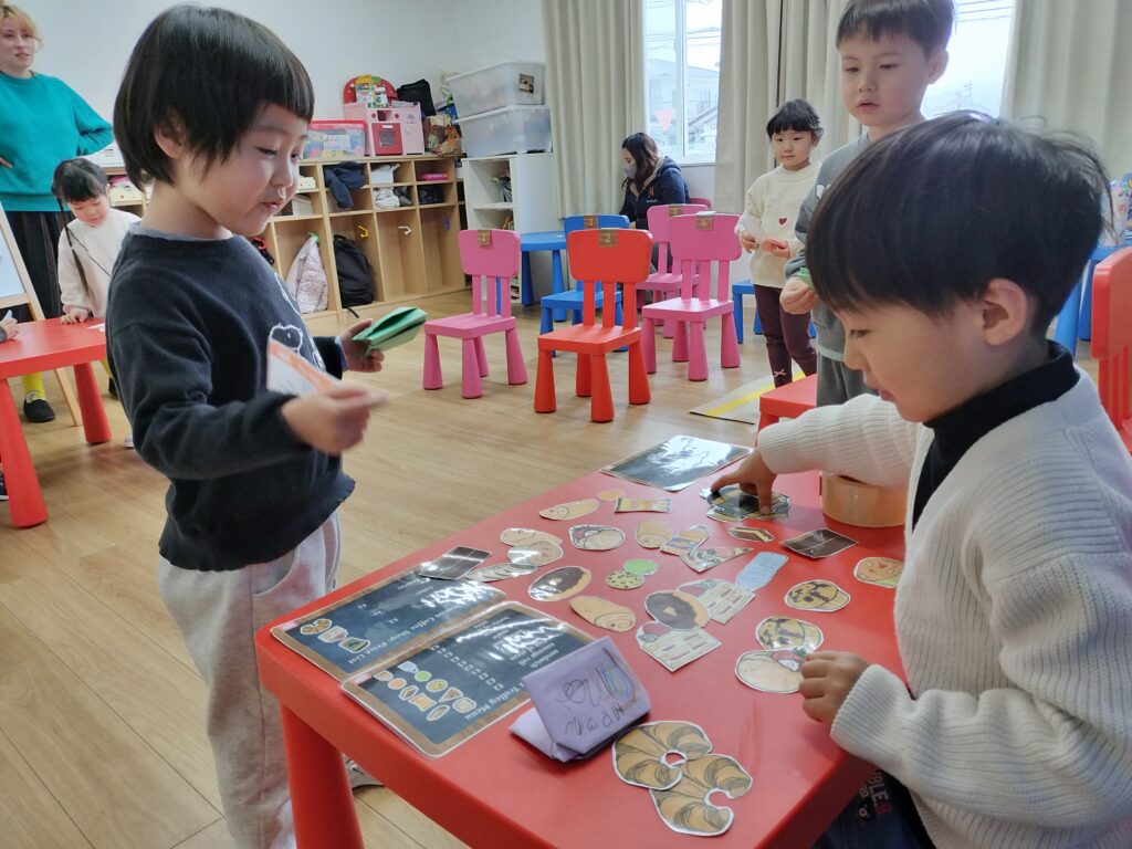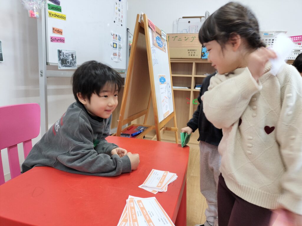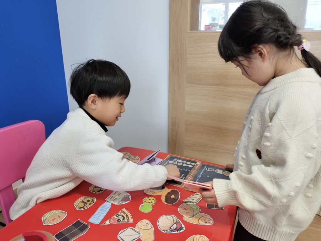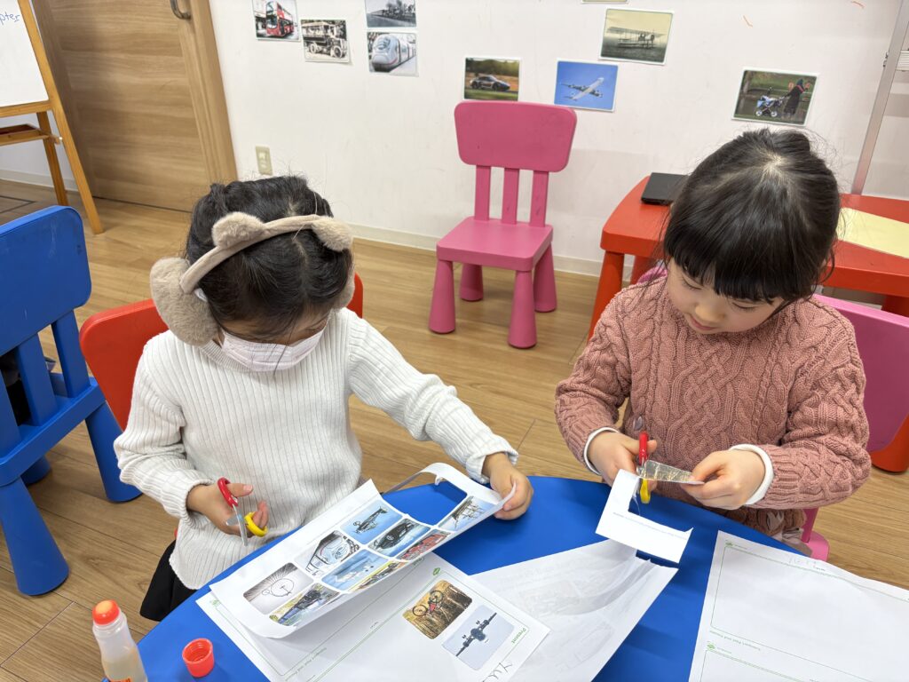 From Wednesday, we began role-playing train station situations. The children practised buying tickets, and because they loved it so much, we expanded our role-play area! We made wallets, cut out money, added a station coffee shop, set up a platform, and even had numbered seats.
