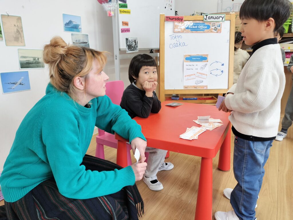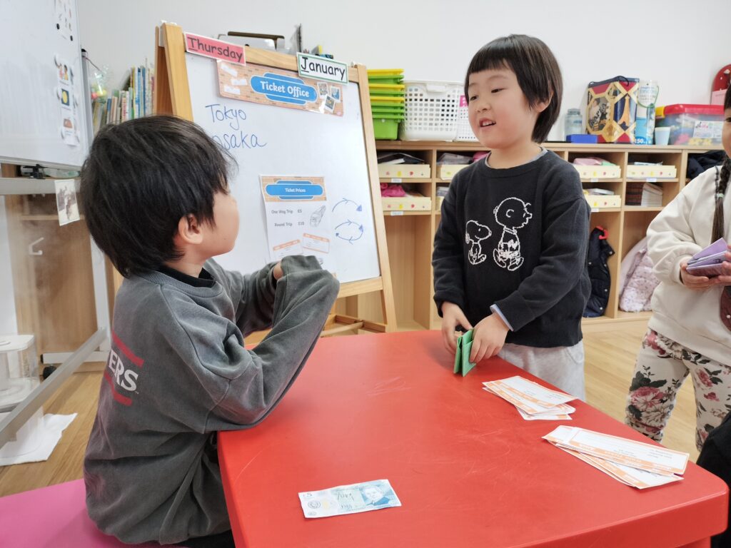 On Friday, we focused on Japanese yen. The children cut out toy yen and received new tickets so they could practise paying in yen (we had been using British pounds earlier). They carefully checked ticket prices—Tokyo or Osaka? One way or round trip?—to make sure they paid the correct amount.