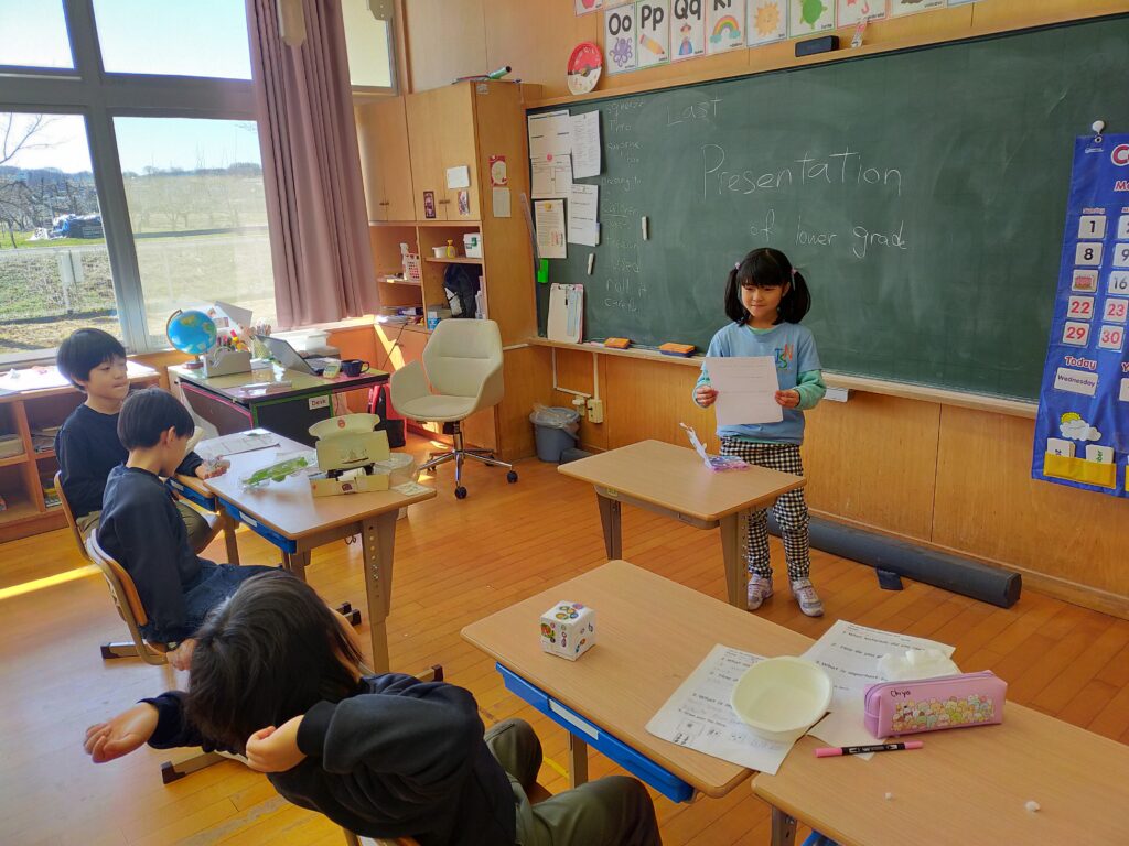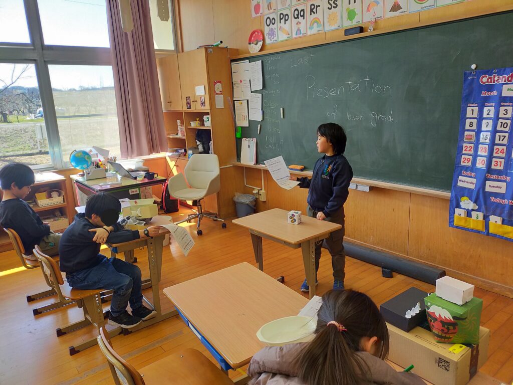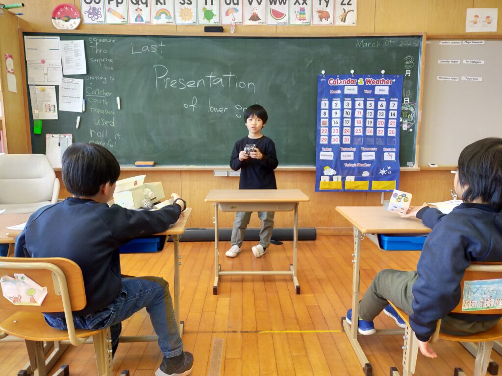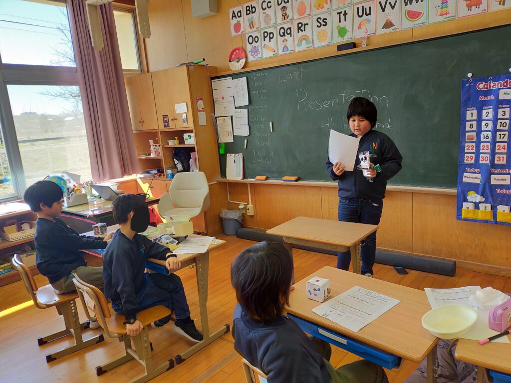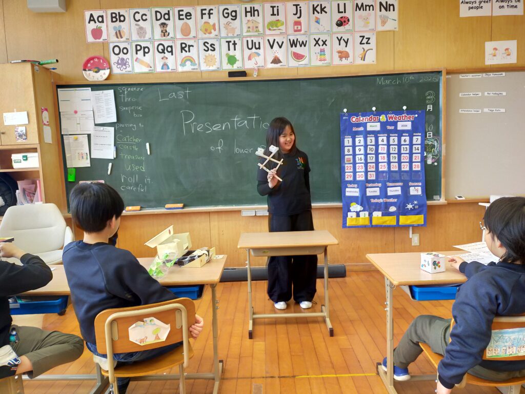 また、プロジェクトの最終発表も行いました。子どもたちは学校にある材料を使って作ったおもちゃを一人ずつ発表しました。これらのおもちゃは、来週プレゼントとしてプリスクールの子どもたちに寄付する予定です。