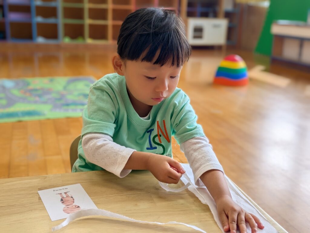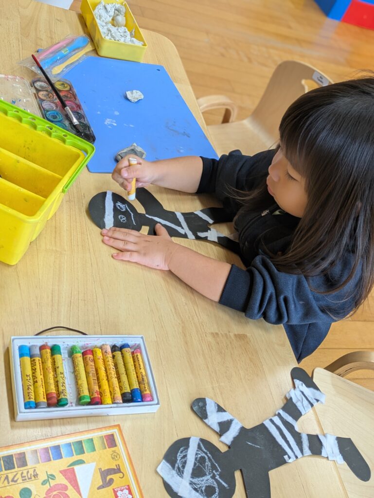紙をビリビリ、ペタペタと貼って、お顔も描いて…完成まであともう少しです。