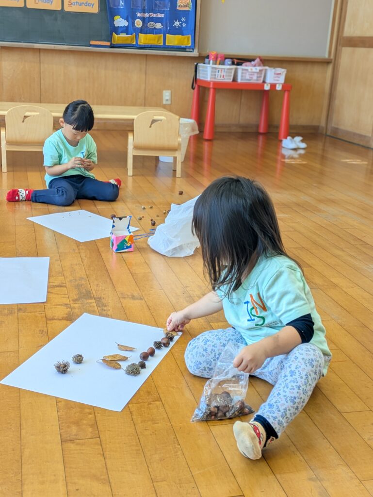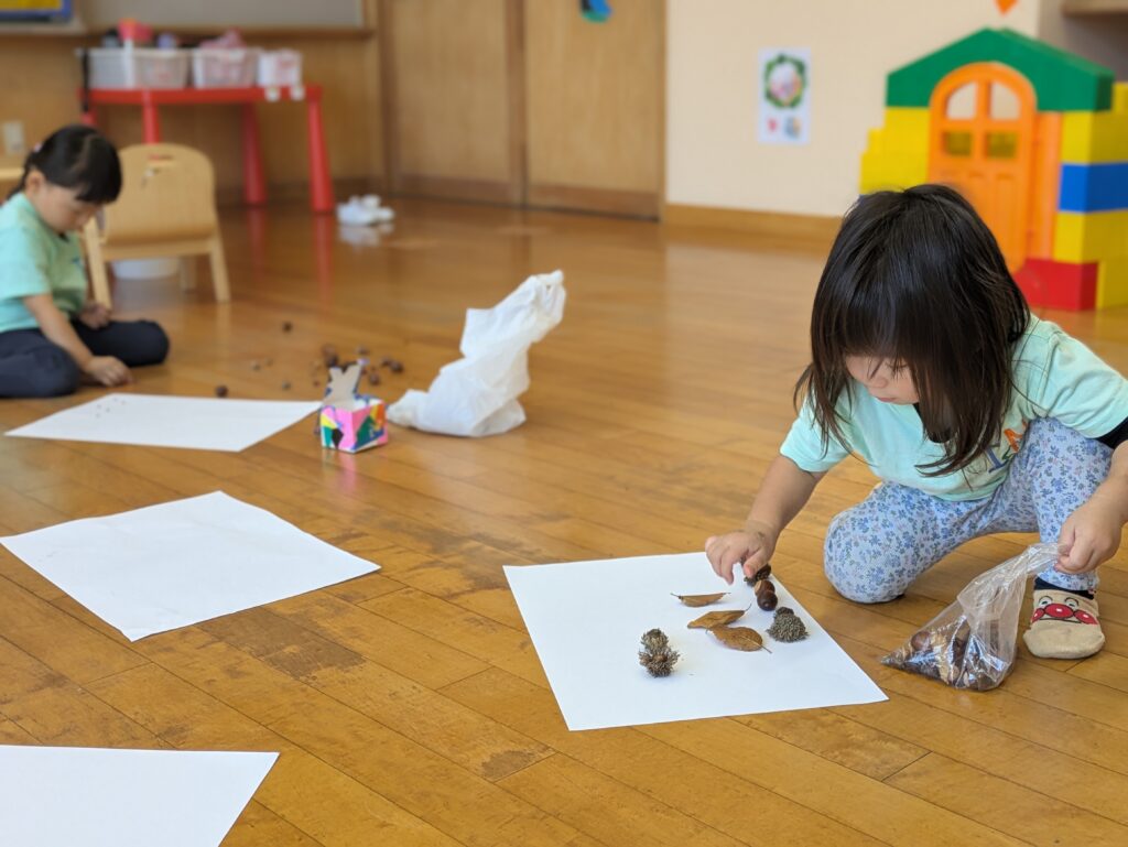 室内あそびでは、遠足で集めてきた木の実や葉っぱを紙の上に並べて、ひとつひとつ貼りました。