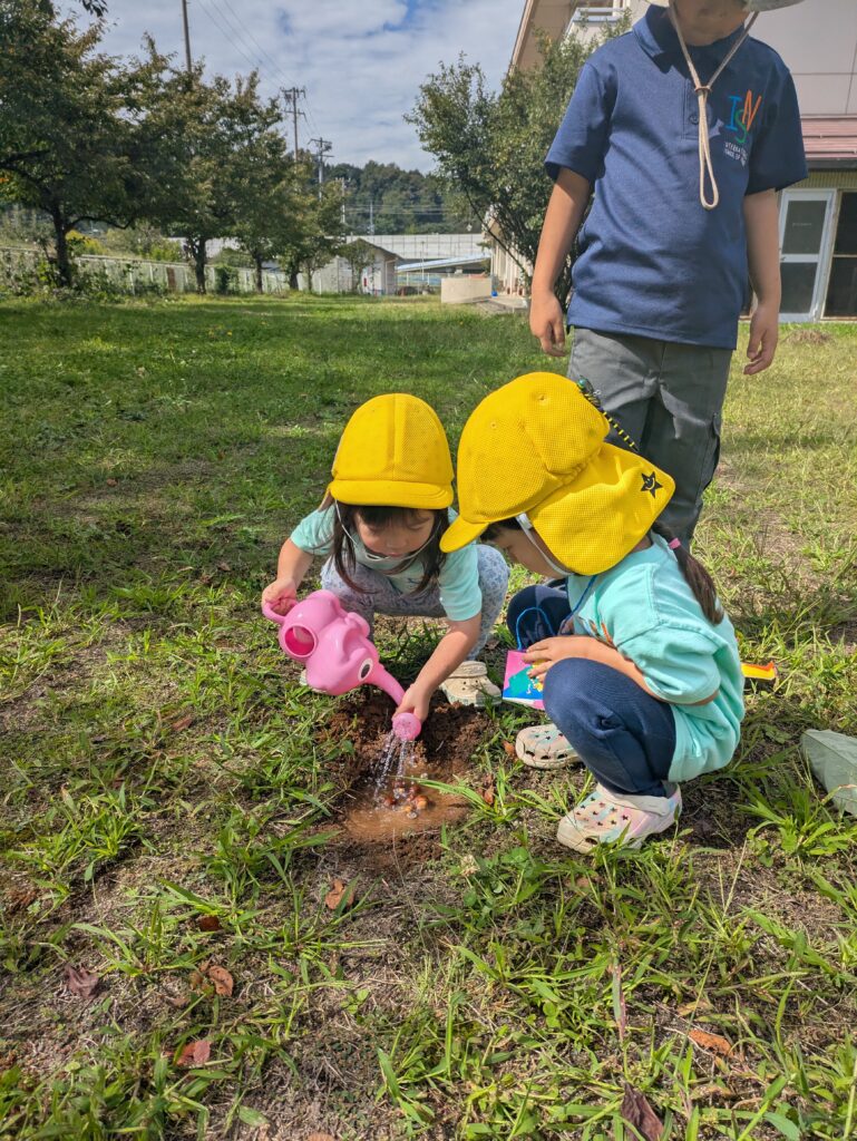 どんぐりが少し残ったので、今度はグラウンドの土の中に植えてお水をあげるレインボーさんたちの姿も。