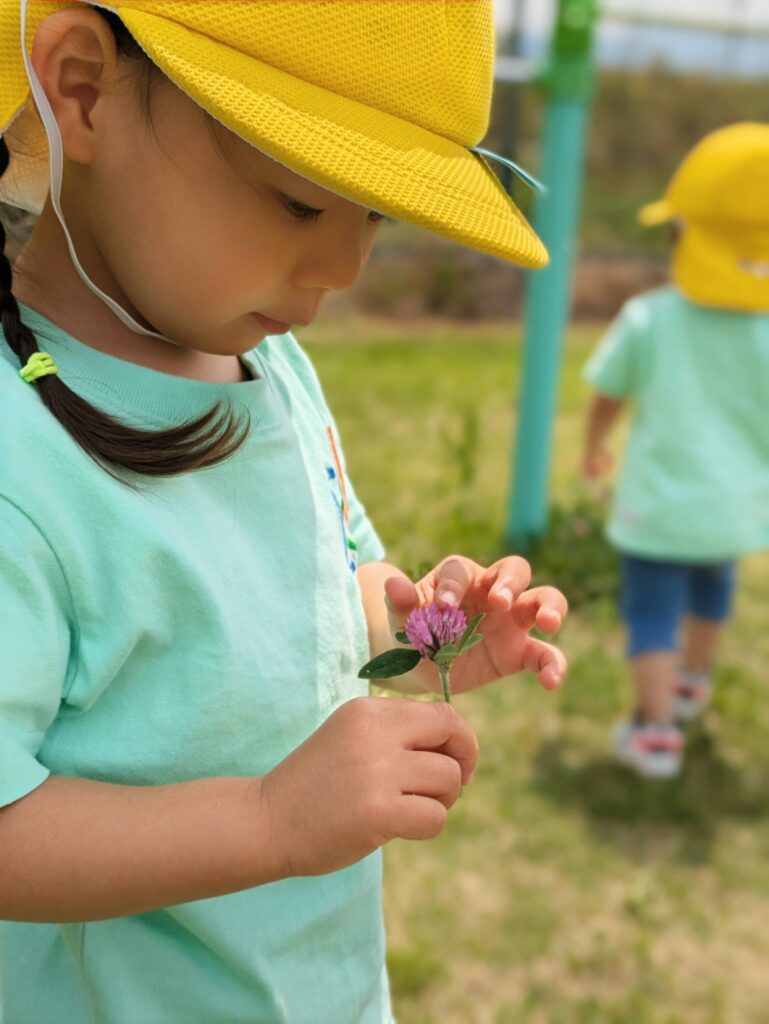 お散歩では、大きなフキの葉を見つけて、傘のようにして遊んだり、さまざまな発見を楽しんでいます。中庭では、「よーいどん!」とお友だちとかけっこをしたり、水や石を使って、想像をふくらませたごっこ遊びに夢中になったりと、遊びにのびのびと取り組む姿がとても素敵です。
