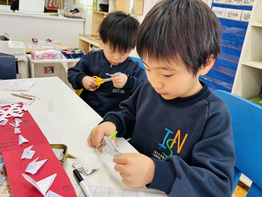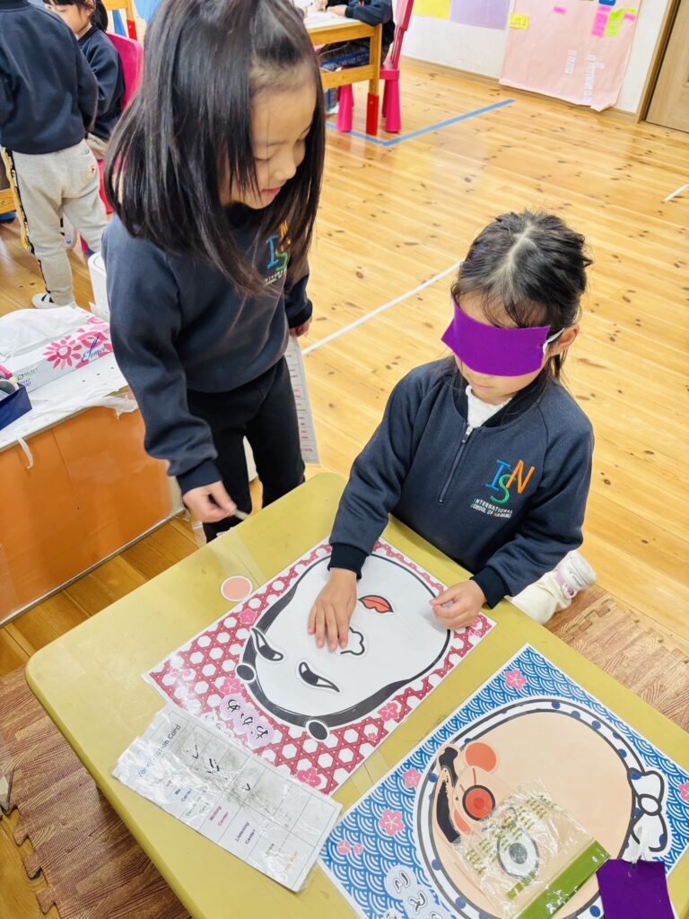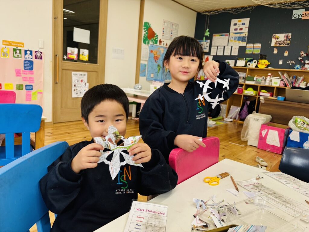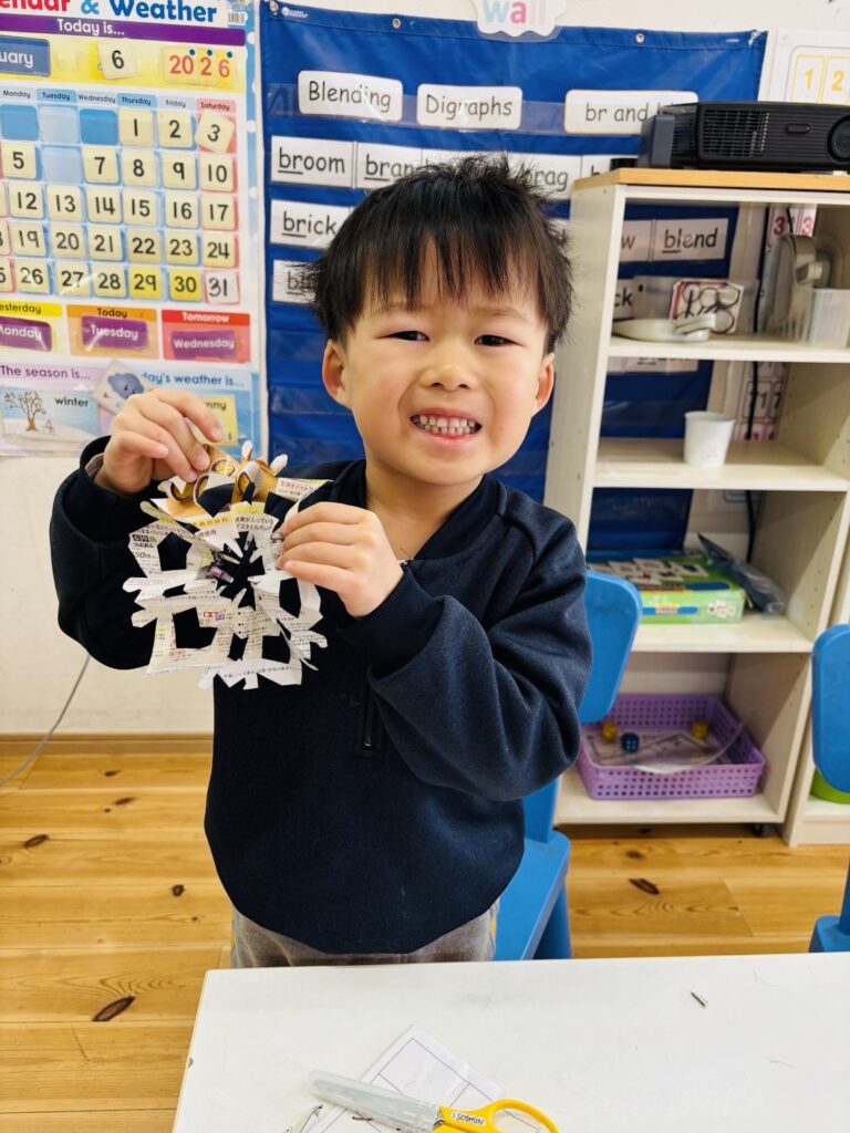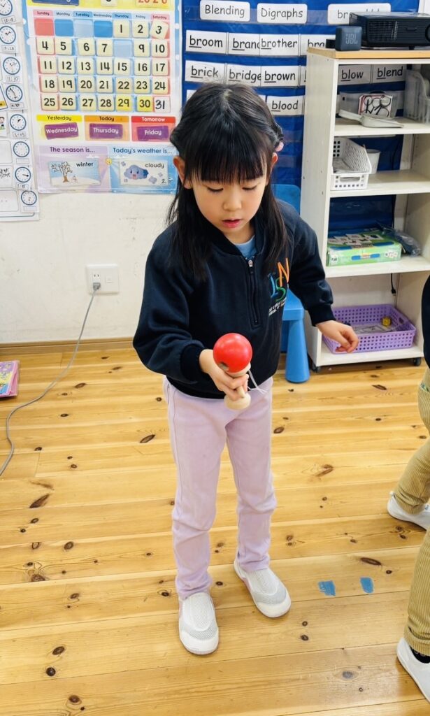 Next, the children explored new games and activities at their workstations, such as a Japanese card game, kendama, and folding and cutting snowflakes. These activities helped develop their focus, creativity, and coordination.