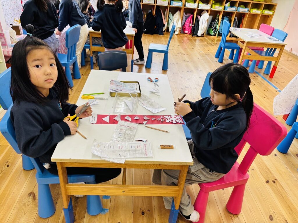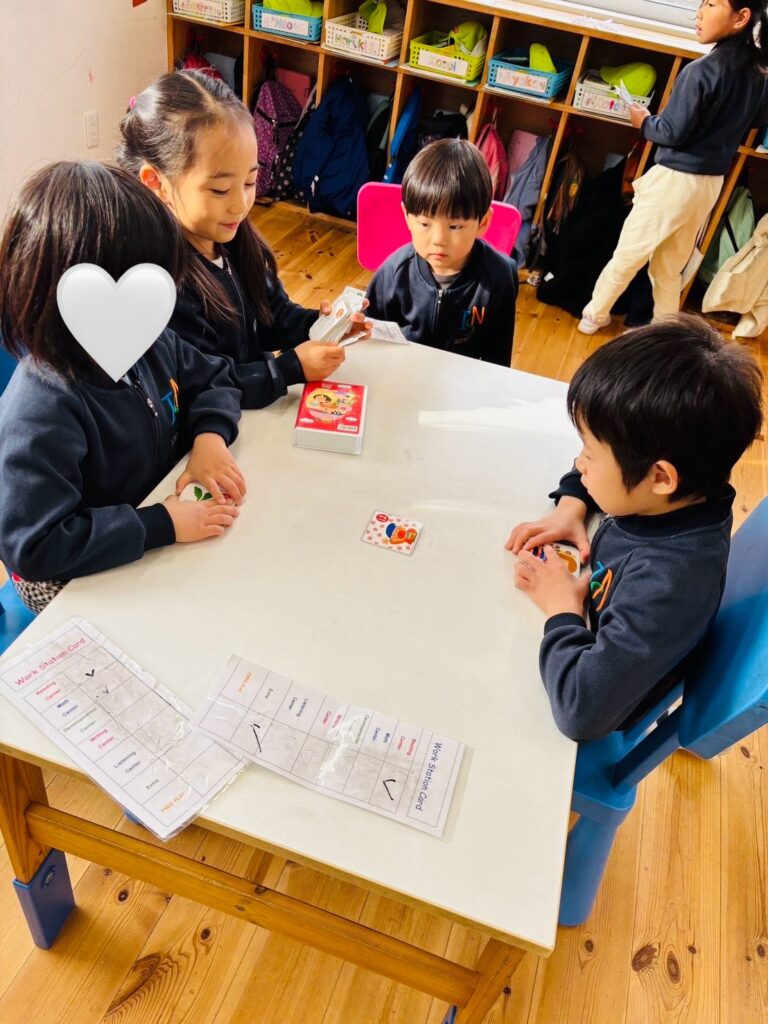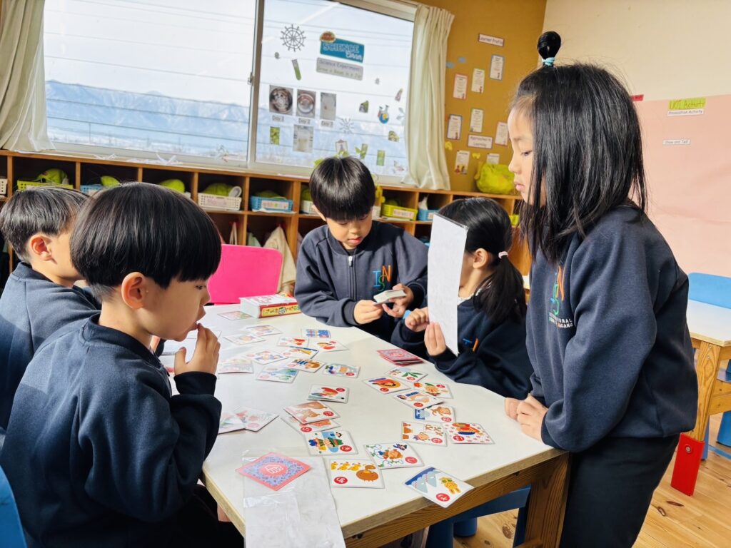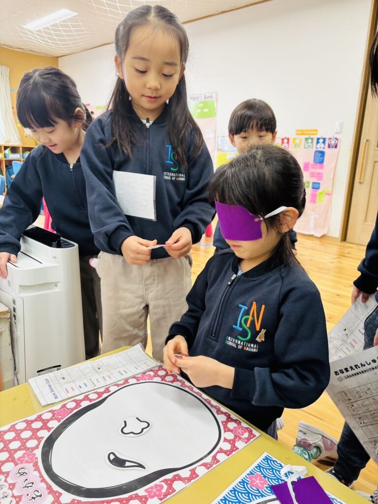 Next, the children explored new games and activities at their workstations, such as a Japanese card game, kendama, and folding and cutting snowflakes. These activities helped develop their focus, creativity, and coordination.