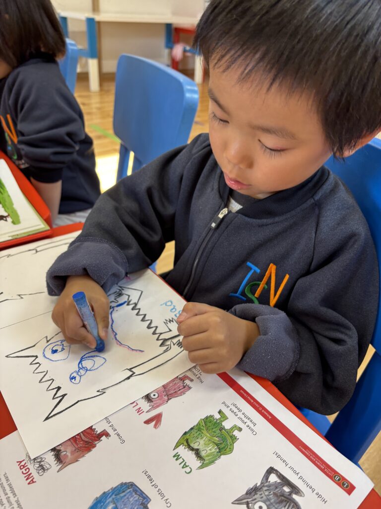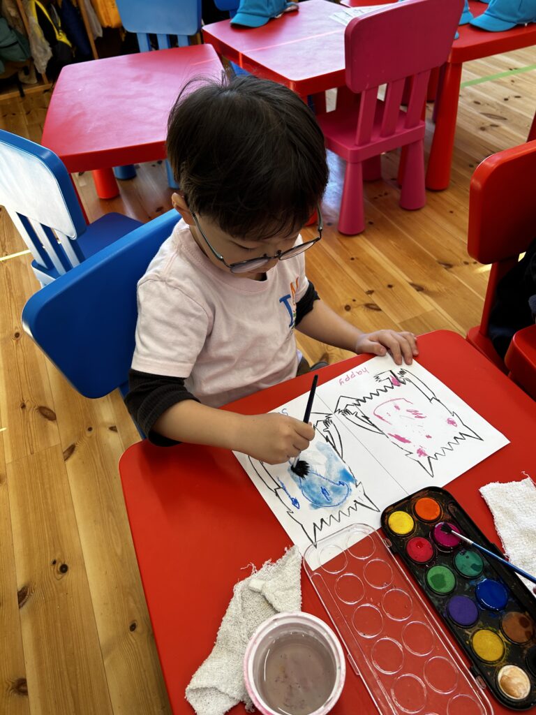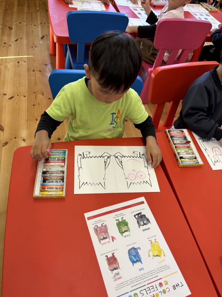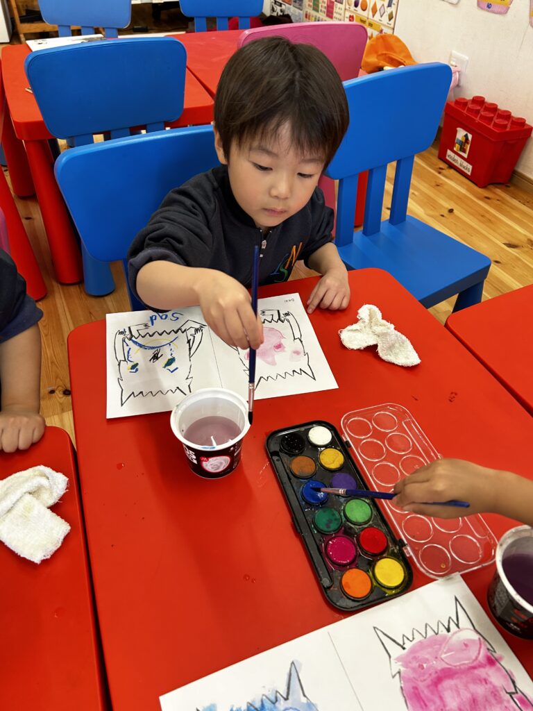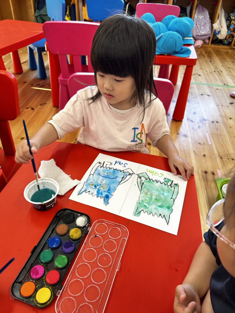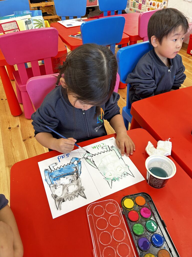 We made a colour monster craft with a crayon resist method – watercolour over oil pastel crayons. Canyon tried using watercolour for the first time. We had a relaxing time painting the monsters. Each student had to choose 2 different types of feeling – one good, and the other not so good (happy, angry or calm, sad). Then we made a Colour Monster stick puppet!