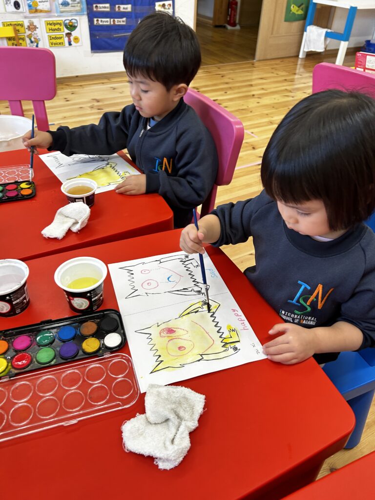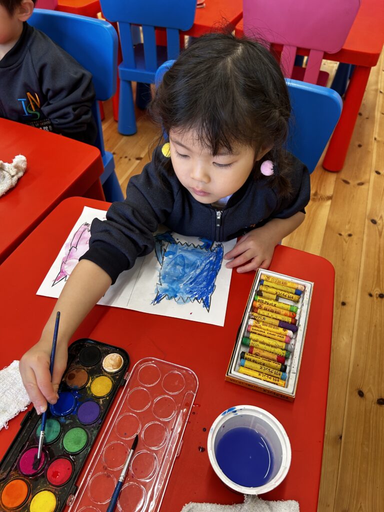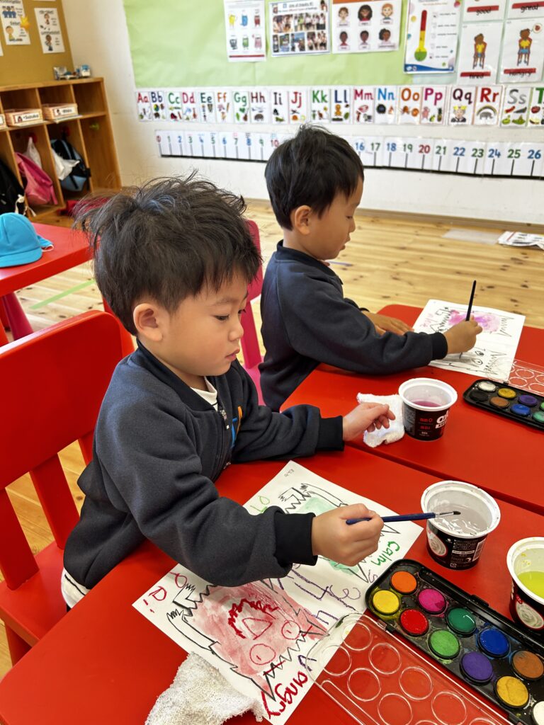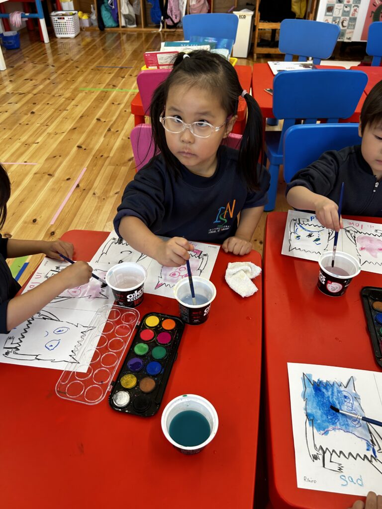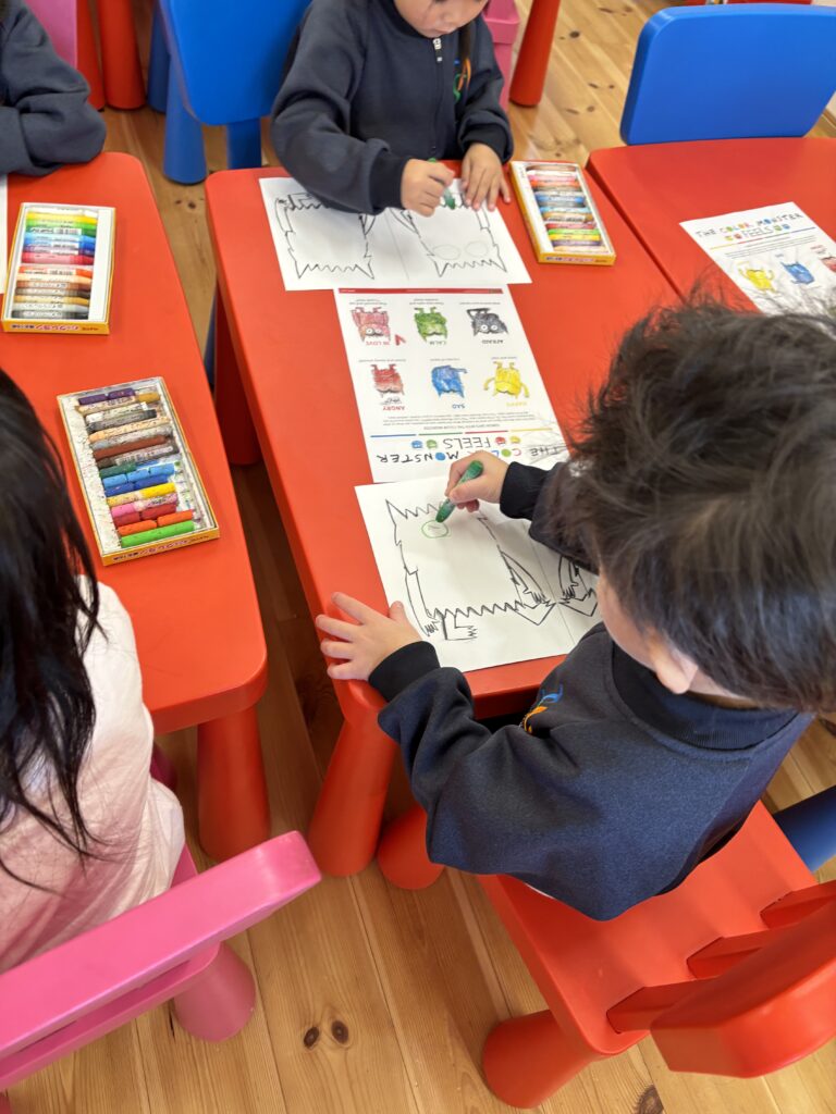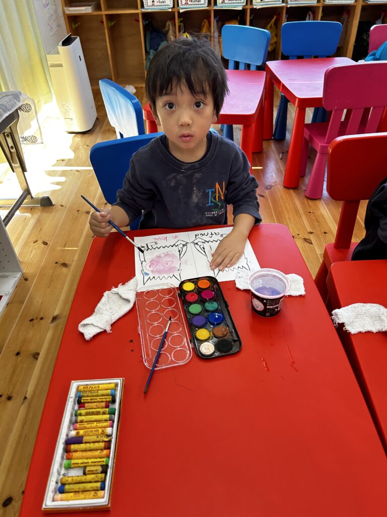 We made a colour monster craft with a crayon resist method – watercolour over oil pastel crayons. Canyon tried using watercolour for the first time. We had a relaxing time painting the monsters. Each student had to choose 2 different types of feeling – one good, and the other not so good (happy, angry or calm, sad). Then we made a Colour Monster stick puppet!