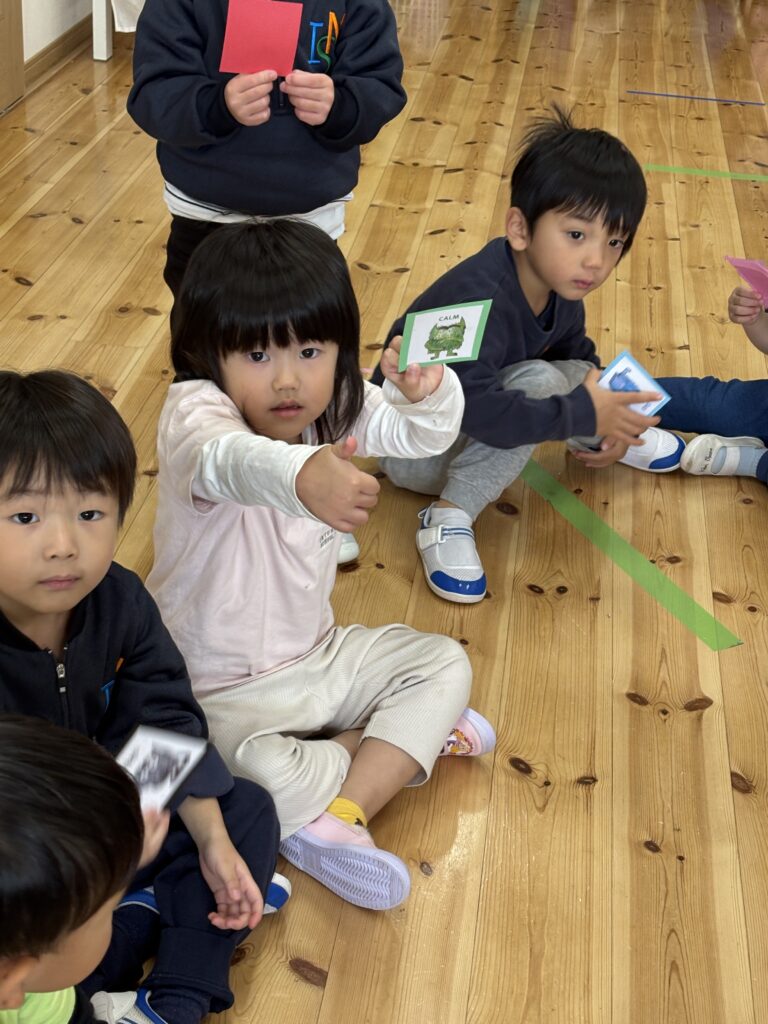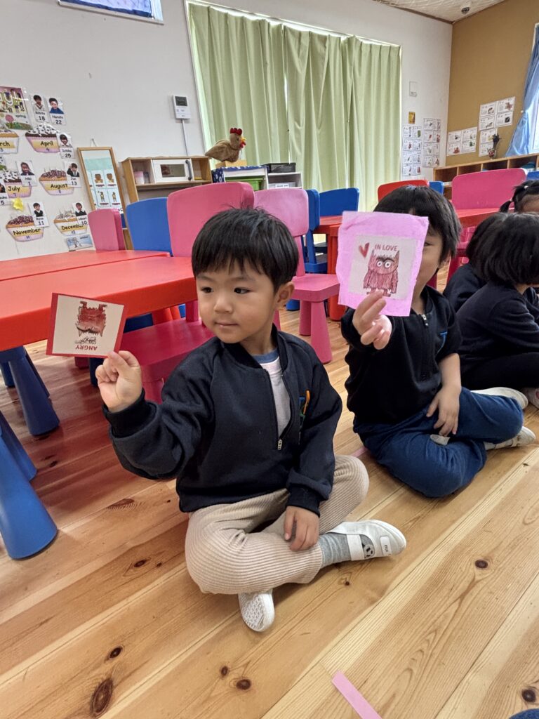 As our morning circle song goes, “I’m good, I’m great…. I’m tired, I’m not so good.” We have many different feelings – some good and some not so good. We played a game The Colour Monster feels… HAPPY! Jump and clap! With picture cards, Canyon sorted out the GOOD (thumbs up) and NOT SO GOOD (thumbs down) feelings. Happy, In love, Calm, Excited, Wonderful vs Angry, Sad, Afraid, Grumpy.