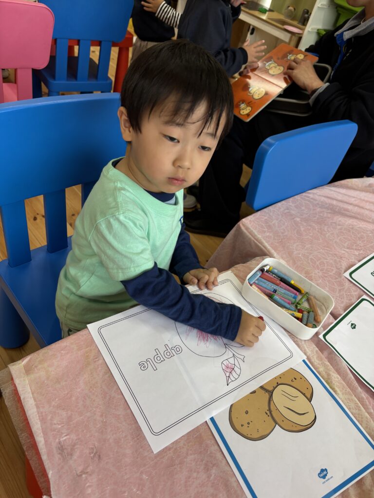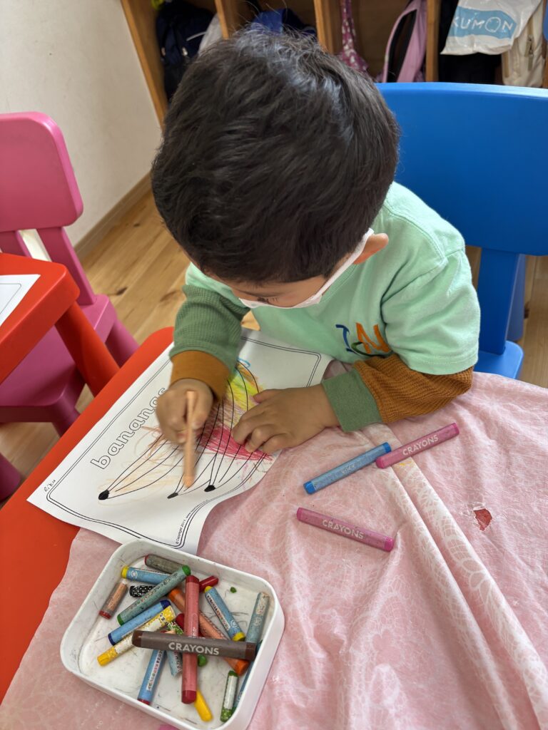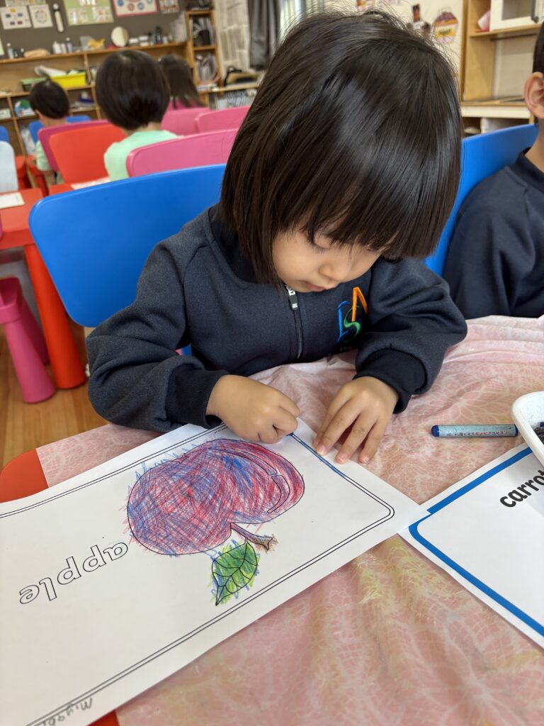 We are beginning to see strong student agency as the children confidently express their ideas, make choices, and participate in discussions. They are learning that their opinions matter and that they can communicate them in ways that others can understand. It was especially heartwarming to hear them say, “I like banana,” “I like grapes,” and “I like watermelon,” showing both language development and growing confidence. They also chose outlines of foods they preferred and coloured them as carefully as they could, taking the opportunity to further develop their fine motor skills.