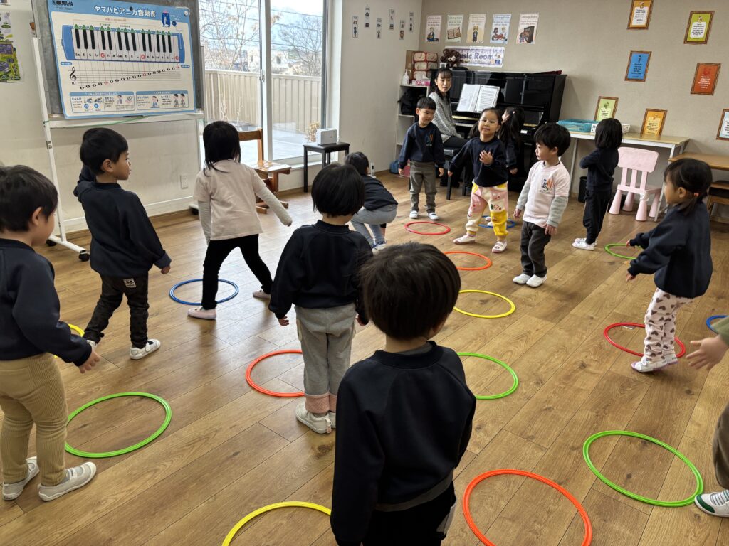 Canyon learned about beats in music and sang a new Japanese song. They placed games with hula hoops too.