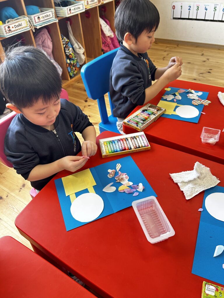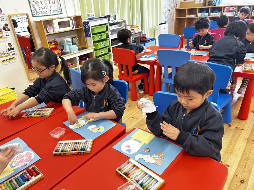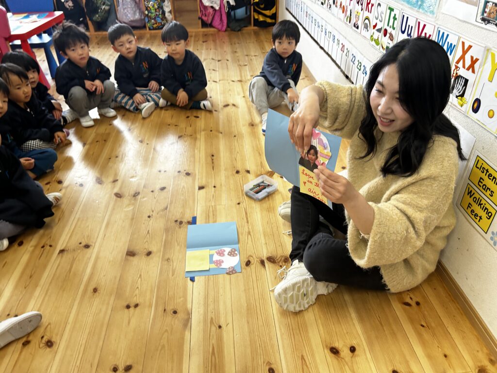 Canyon sang… H-E-A-R-T means I love you! We made cards for our family because we love you all. Not just any card but a Hot Air Balloon card with lots and lots of Hearts! Yes, we linked that to the unit on Transportation. We practised writing our names on the cards too.