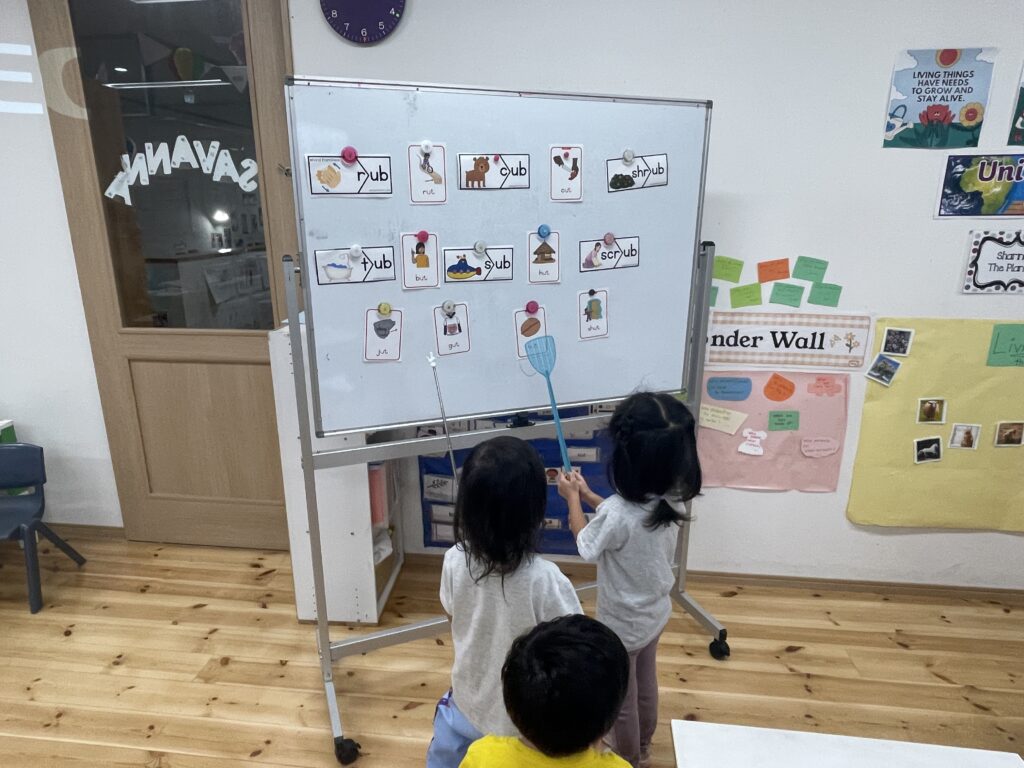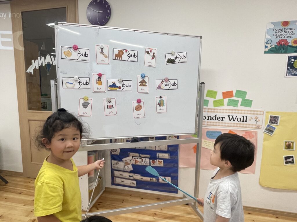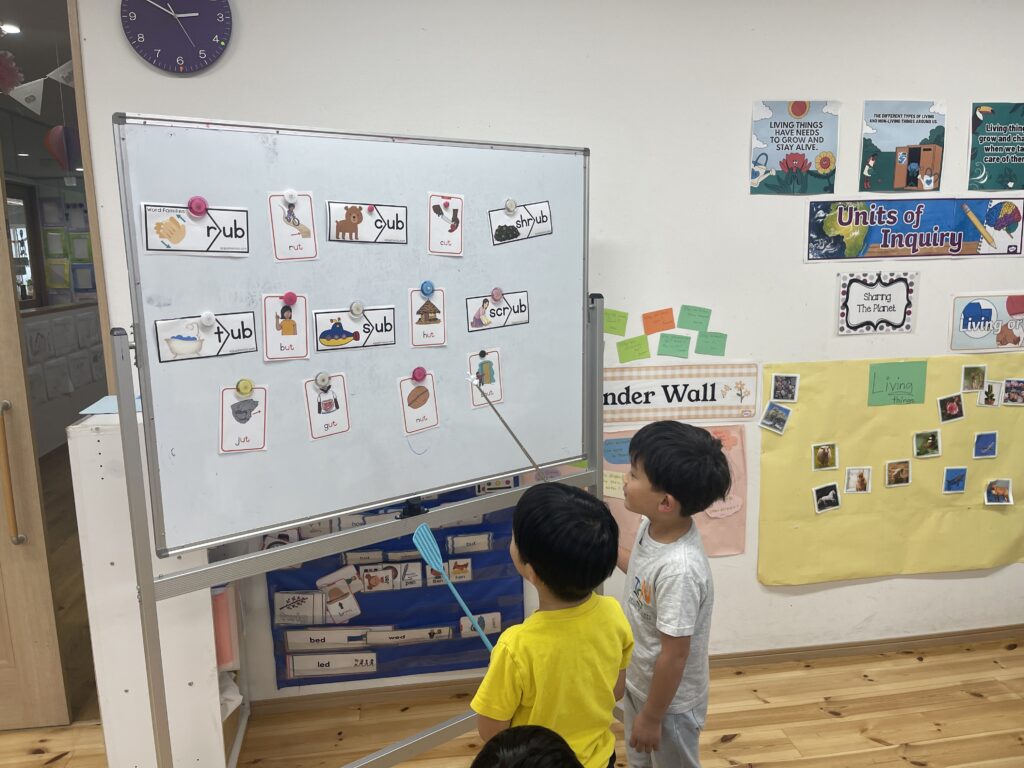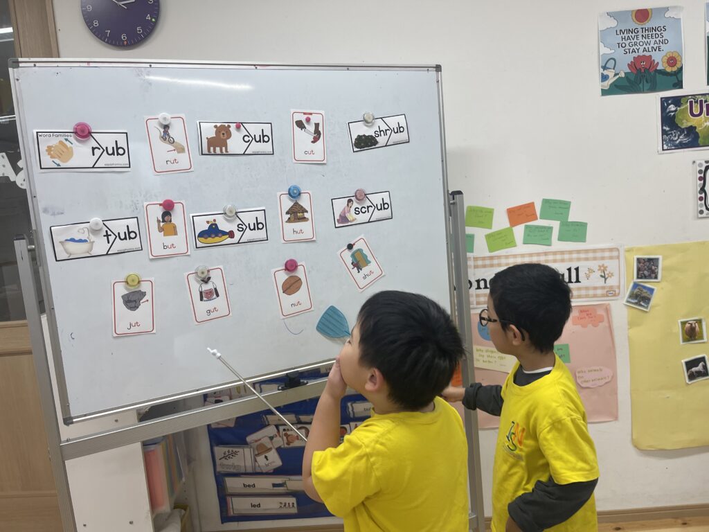 フォニックスでは、新しいワードファミリー「/ub/ – /ut/」を学びました。子どもたちは、すでに一文字ずつの音を理解し、つなげて読むことができるので、とても簡単に感じたようです。私たちも、子どもたちの成長にとても誇りを感じています。