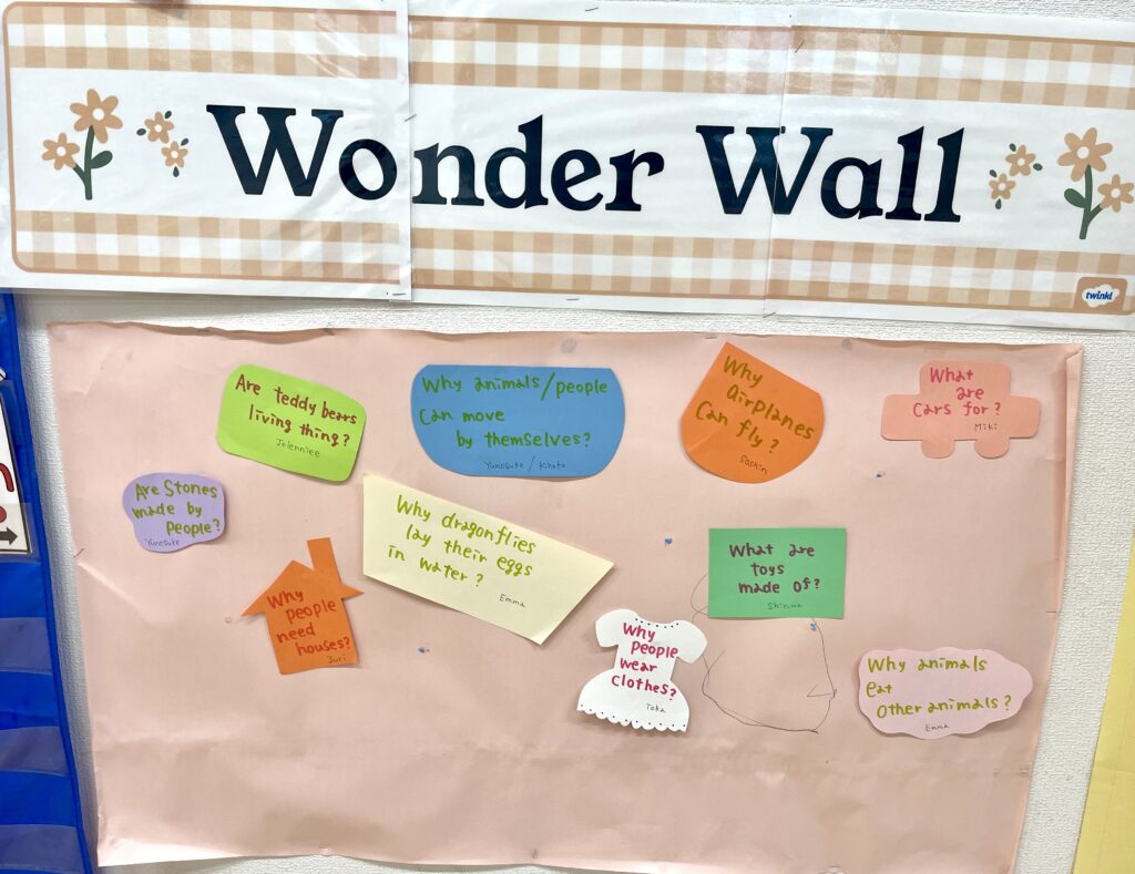 例えば、「どうして動物は他の動物を食べるの?」「どうして動物は自分で動けるの?」「石は人が作ったもの?」「テディベアは生きているもの?」など…。集まった質問はいつでも見返せるよう、ワンダーウォールに掲示しています。これからUOIを進めていく中で、少しずつ答えやヒントを見つけていけることでしょう。子どもたちは、自分たちの疑問を探っていくことをとても楽しみにしています!