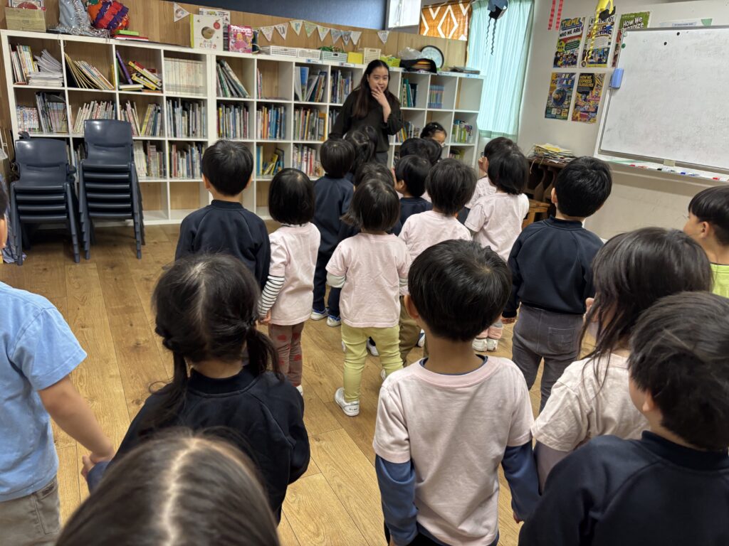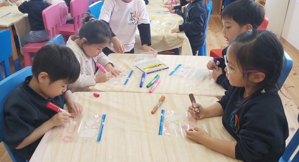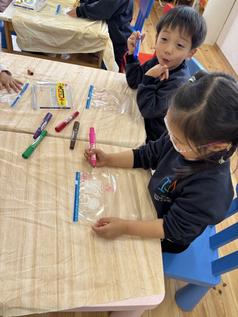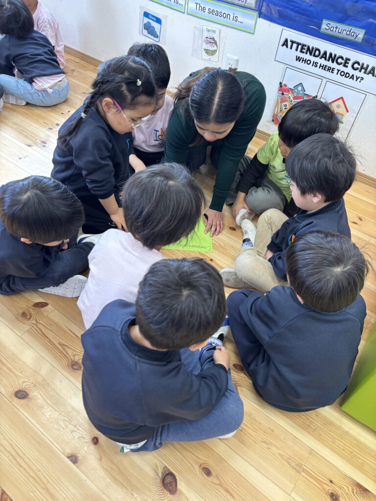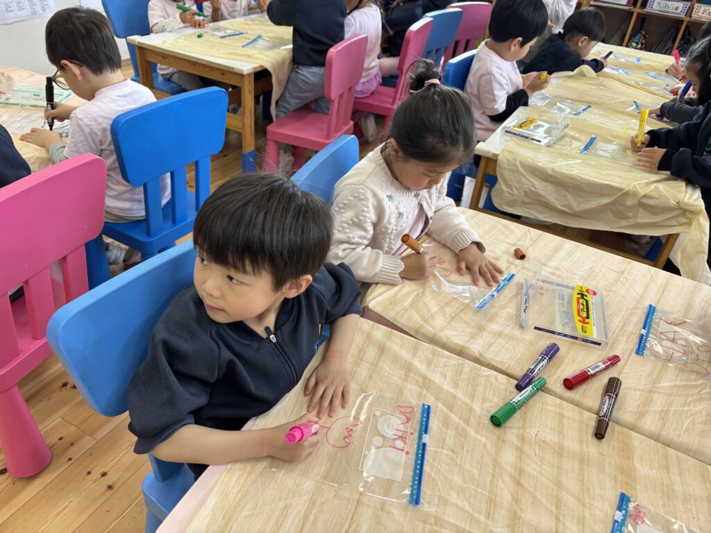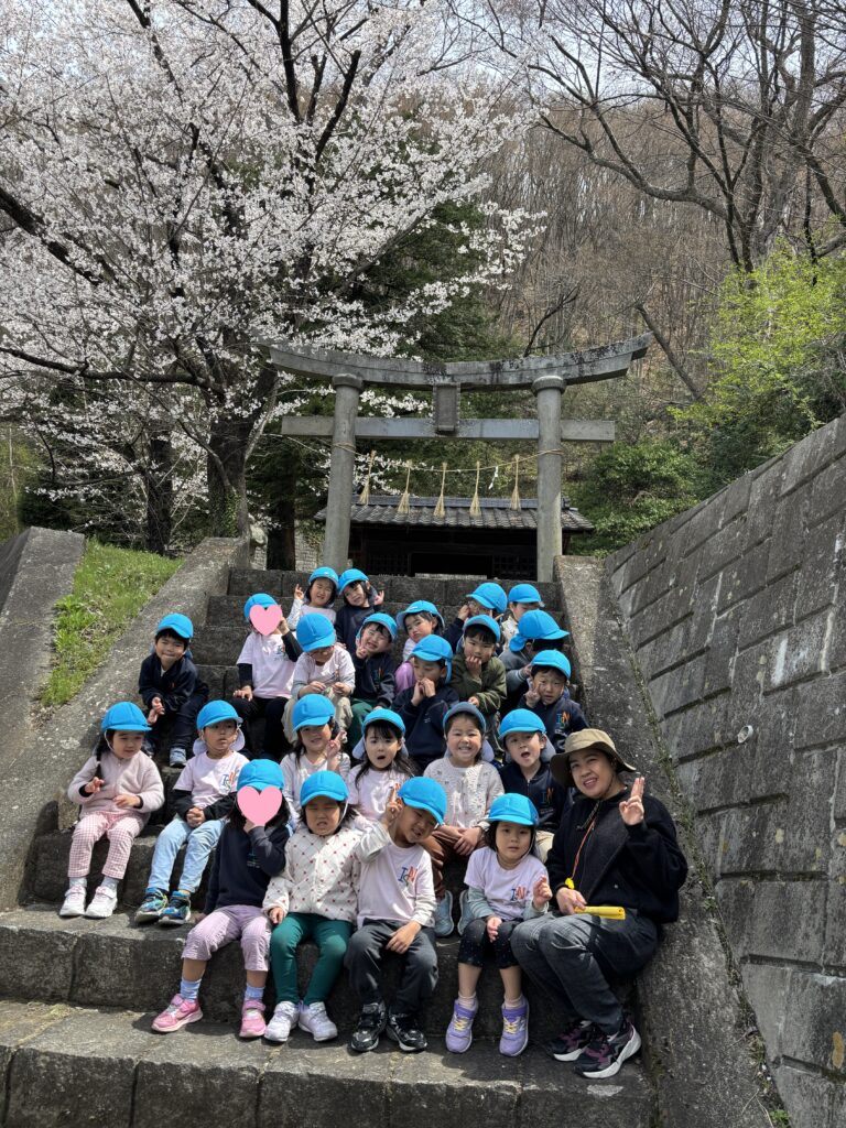 To celebrate the season, Ms. Shizuka read a story about spring. Inspired by the story, students created nature bags using ziplock bags and decorated them with colorful drawings of flowers, hearts, grass, and more. This activity allowed them to express their creativity while appreciating the beauty of spring. The class also enjoyed a walk outside, where they practiced walking safely along the road. They visited a nearby shrine, admired the beautiful cherry blossom trees, and took photos, making the experience both fun and memorable.