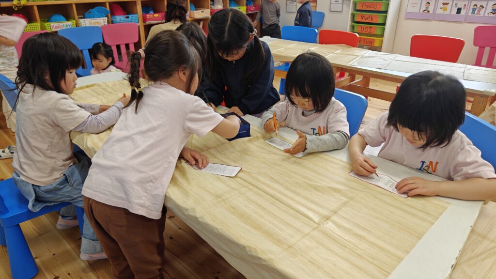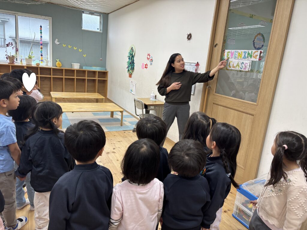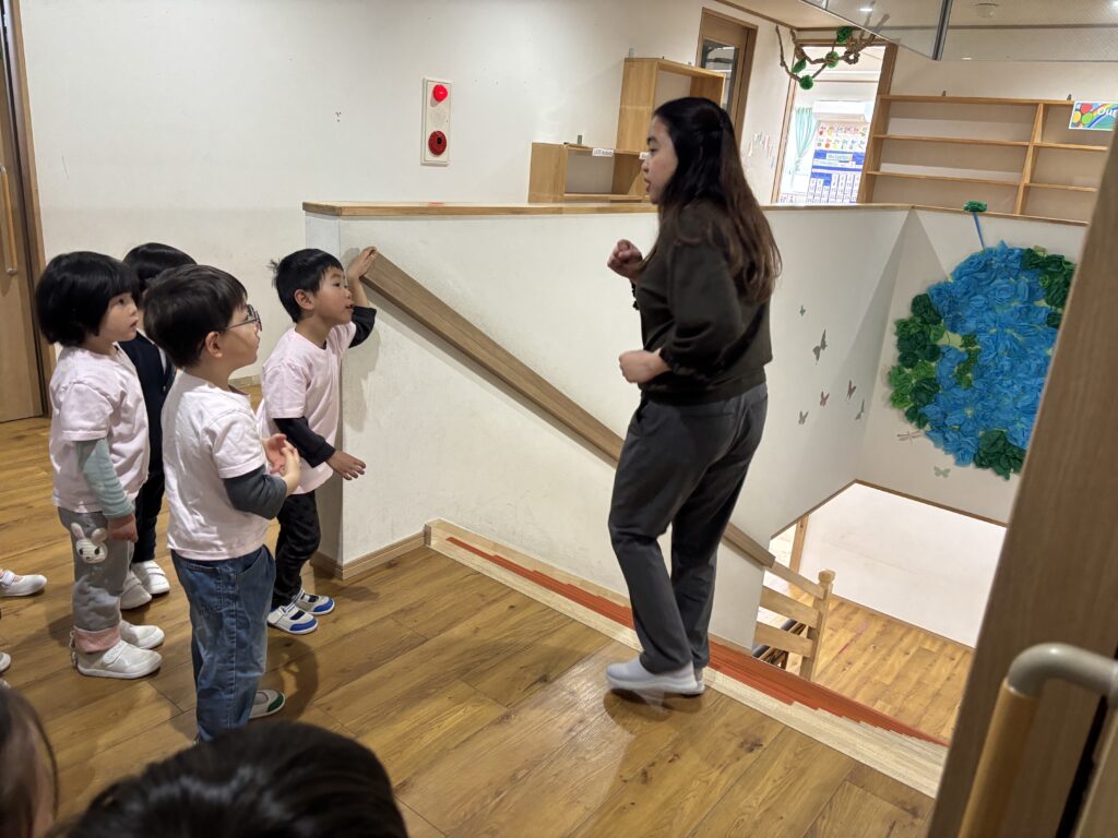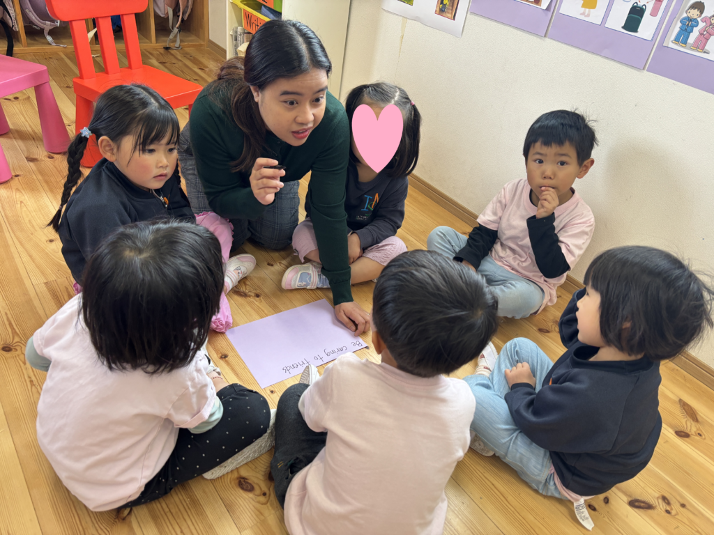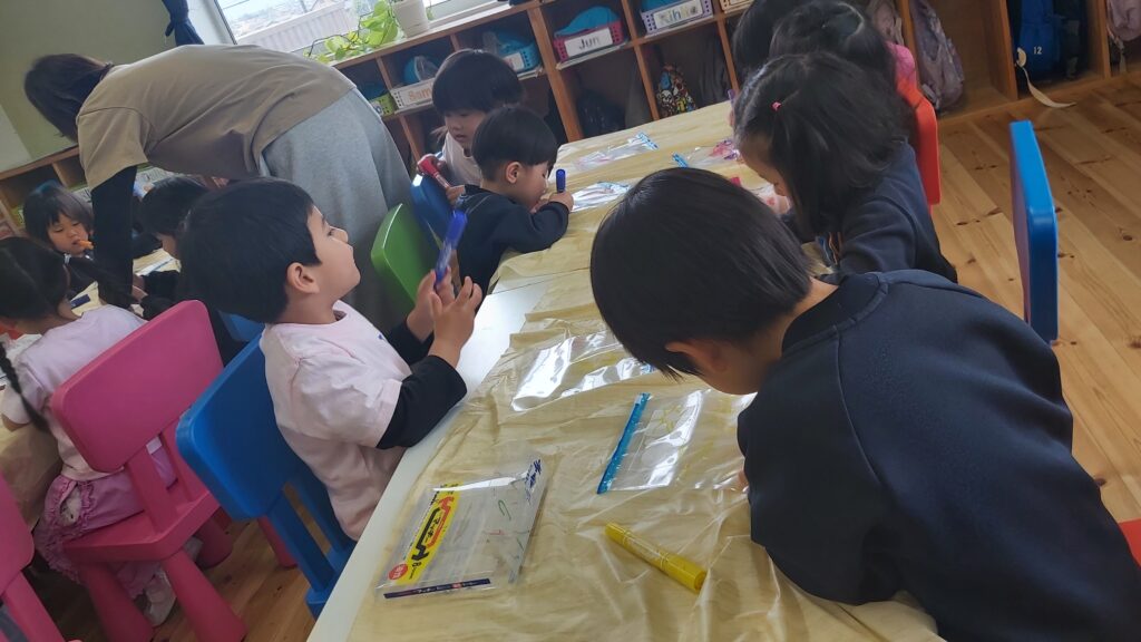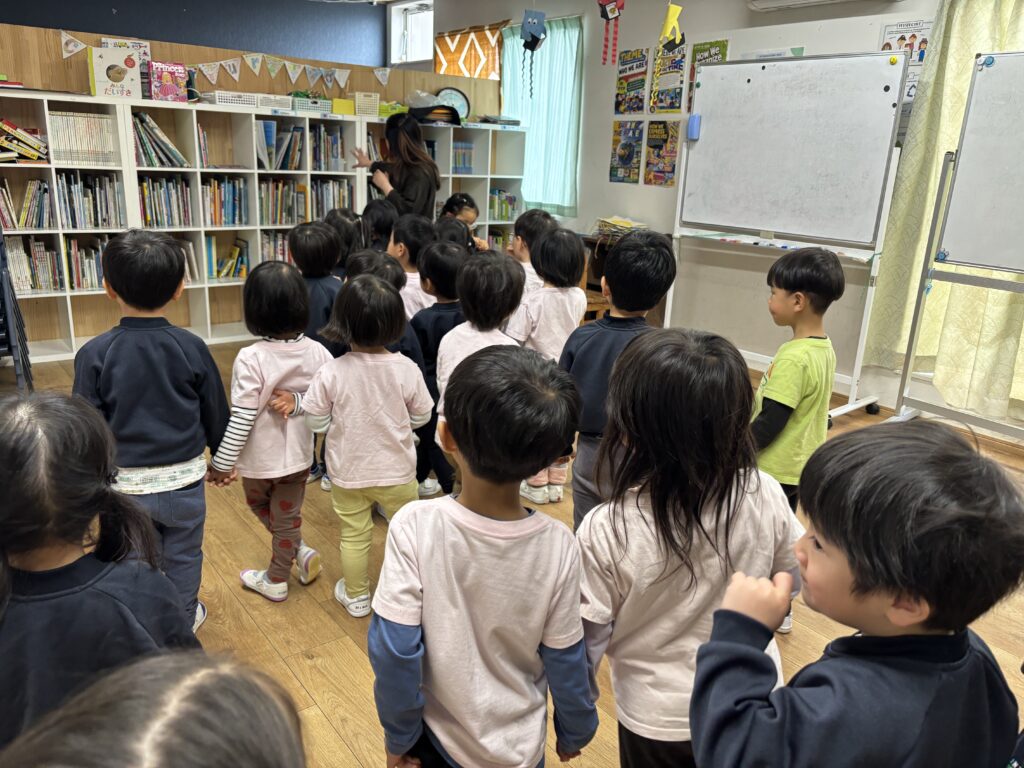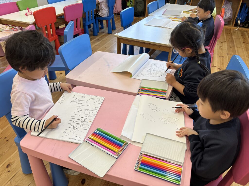 To celebrate the season, Ms. Shizuka read a story about spring. Inspired by the story, students created nature bags using ziplock bags and decorated them with colorful drawings of flowers, hearts, grass, and more. This activity allowed them to express their creativity while appreciating the beauty of spring. The class also enjoyed a walk outside, where they practiced walking safely along the road. They visited a nearby shrine, admired the beautiful cherry blossom trees, and took photos, making the experience both fun and memorable.