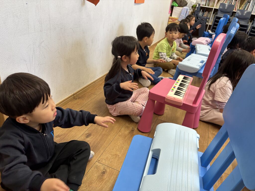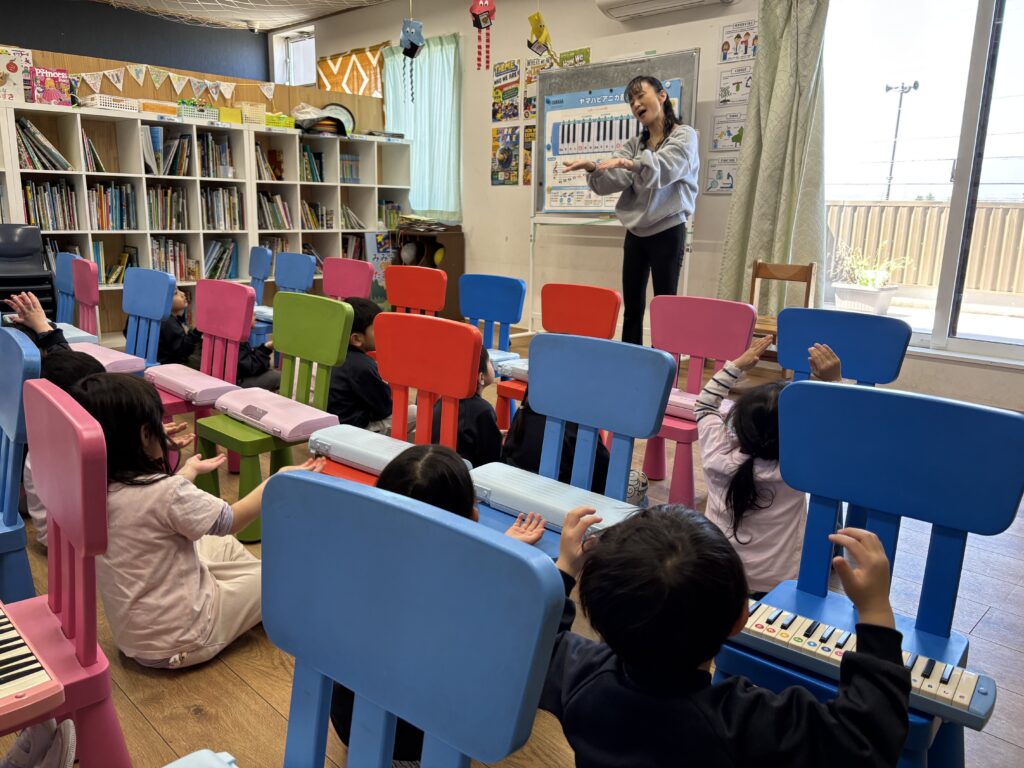 During their music lesson, students used the pianica for the first time. They learned how to position their hands by making a peace sign to find the two black keys and used their thumb to play the “Do” note. Students were excited and proud when they successfully produced their first sound.
