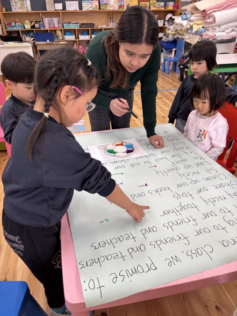 In the classroom, students worked together to create their essential agreements by sharing ideas on how to keep everyone happy and safe. Students formed groups based on their favorite colors—green, blue, orange, or purple—and collaborated to share their ideas. They showed their commitment by adding their fingerprints and names as a promise to follow these agreements.