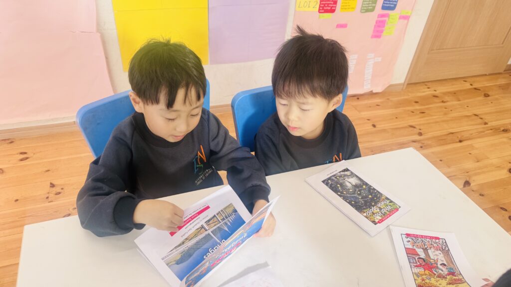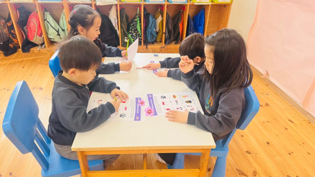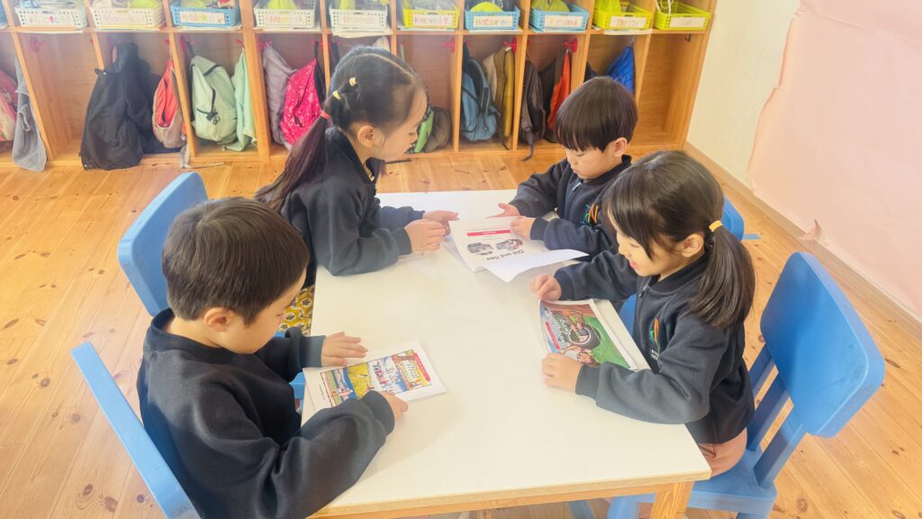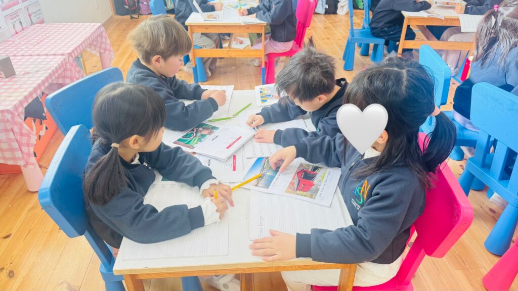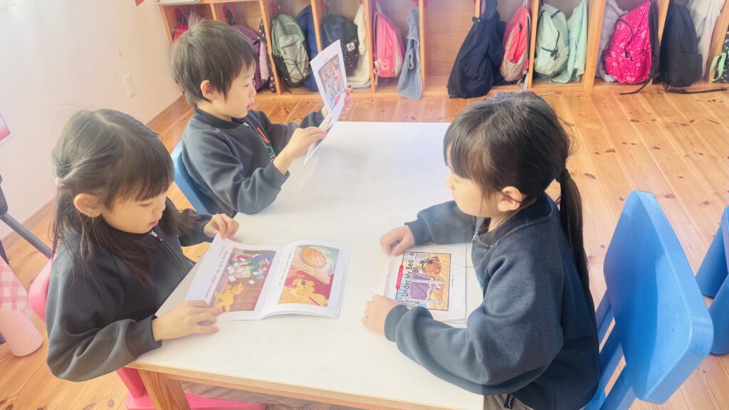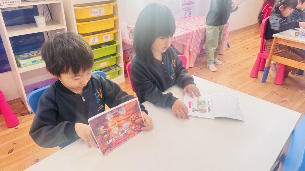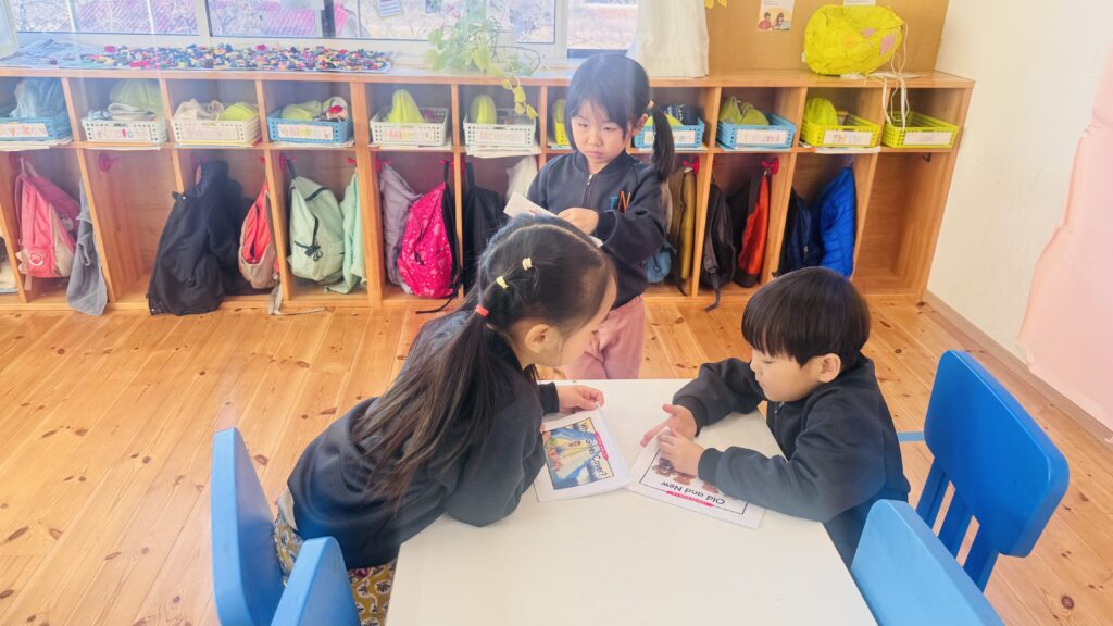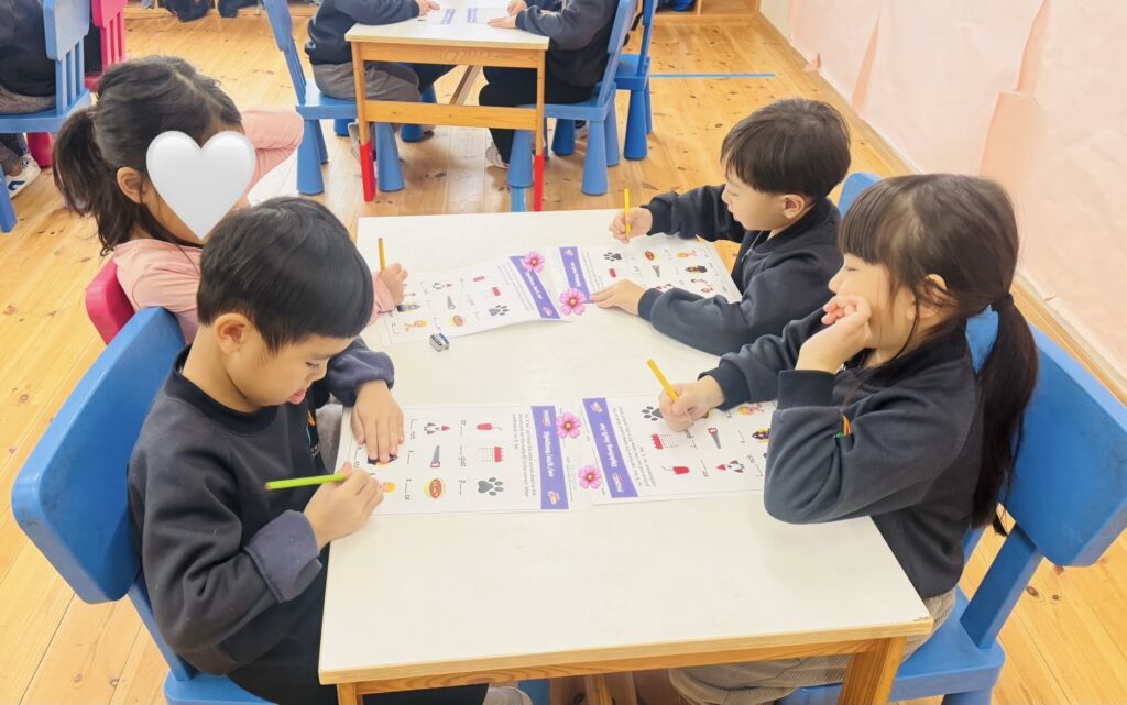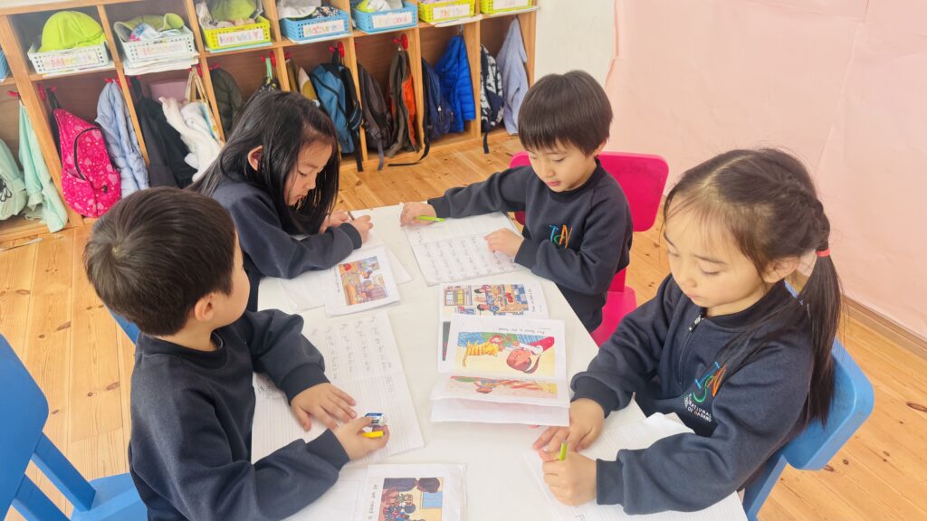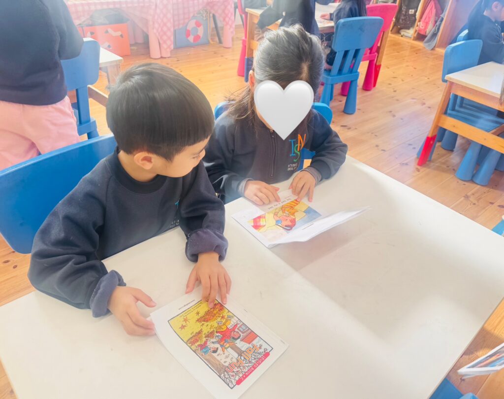 Here’s a glimpse of our reading and writing lessons, where our young learners read a book with their friends and copy a sentence from the book. Through these activities, they practice reading together, develop their writing skills, and build confidence in working both independently and with peers.
