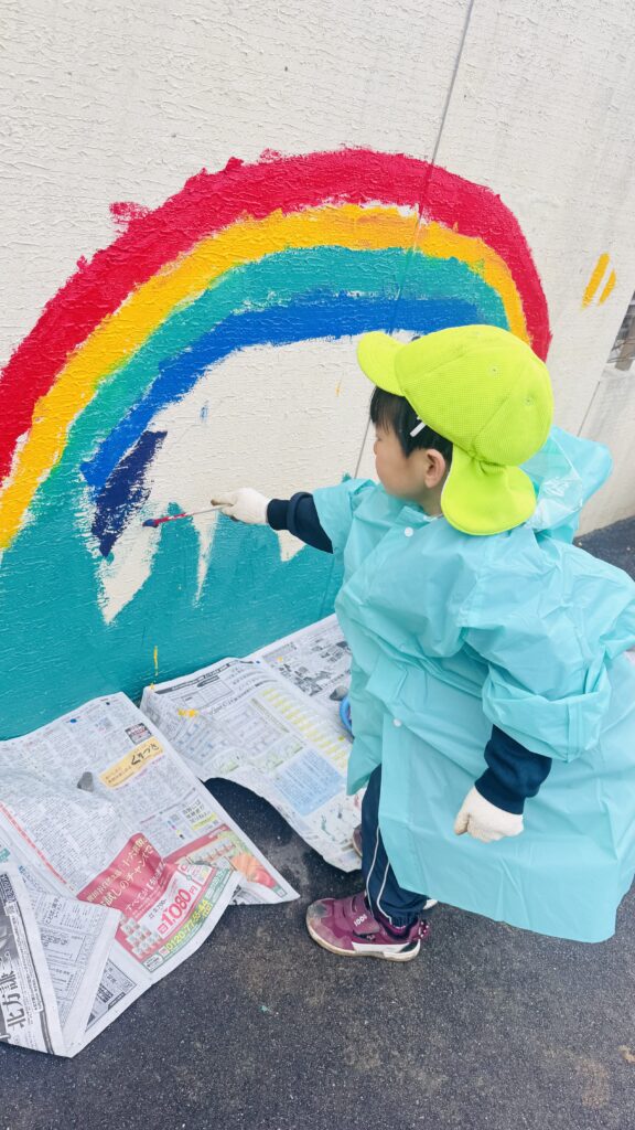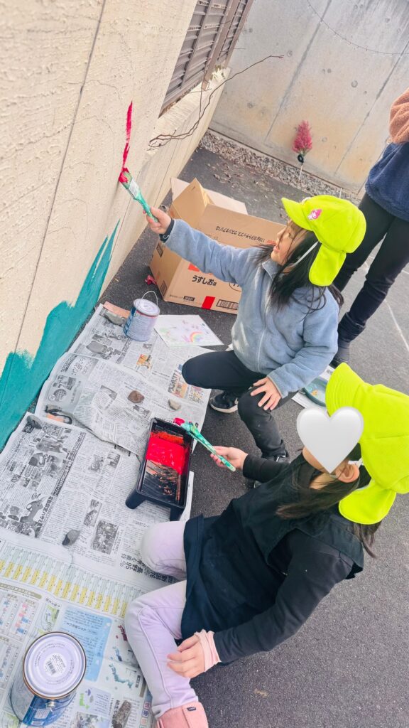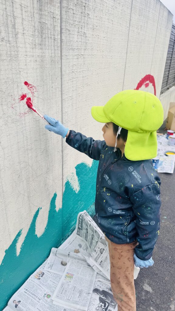 Previously, we asked the children to draw their ideas for painting the schoolyard wall. We then combined everyone’s designs to create one large collaborative artwork. The children have been enjoying painting and have been participating carefully and happily. Thanks to everyone’s hard work, we were able to complete a wonderful wall mural!